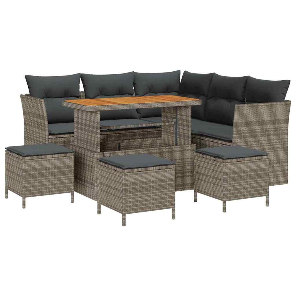 Dieses Garten-Sofa-Set verbindet modernen Stil mit praktischer Funktionalität und ist super für entspannte Treffen im Freien. Mit seinen klaren Linien und dem minimalistischen Design fügt es sich perfekt in zeitgenössische Außenräume ein, während das luxuriöse poly rattan einen eleganten Touch bringt. Die bequemen Sitze laden Familie und Freunde zum gemeinsamen Chillen auf der Terrasse ein und machen deinen Außenbereich zum idealen Rückzugsort für Frühling und Sommer. Robuste Bauweise Mit leistungsstarken Materialien designed, die dafür sorgen, dass das Garten-Sofa-Set lange hält. Der pulverbeschichtete Stahlrahmen bietet Stabilität, sogar bei schlechtem Wetter. In Kombination mit UV-beständigem poly rattan bleibt die Farbe und Form des Möbelstücks über Jahre hinweg erhalten.Hochwertige Materialien Dieses Sofa-Set in Kombination mit poly rattan und massivem Akazienholz sorgt für eine stilvolle Optik. Poly rattan bleibt wetterfest, und die Akazienholz-Oberflächen bringen einen natürlichen Charme.Was ist dabei? Jedes Stück hat eine bequeme Sitz- und Rückenlehne aus poly rattan. Die Oberflächen sind aus massivem Akazienholz, und der stabilen Stahlrahmen sorgt für Sicherheit. Zusammen ergibt das ein Set mit Style und Funktionalität.Flexibel einsetzbar Das Sofa-Set ist perfekt für Gartenpartys und passt sich super an unterschiedliche Außenbedingungen an. Das modulare Design lässt sich leicht umstellen, um deinen Platz optimal auszunutzen. Die höhenverstellbare Funktion sorgt für zusätzlichen Komfort und eine coole Mischung aus Stil und Bequemlichkeit.Pflegeleicht Das Sofa-Set ist einfach zu pflegen. Nutze eine Abdeckung, wenn du es nicht benutzt, damit es immer gut aussieht. Für die Schnelldreinigung reicht ein einfaches Wischen. So bleibt dein Außenbereich immer einladend und zum Entspannen bereit. Farbe: GrauMaterial: Poly-RattanLanglebigModulares DesignAdjustable tabletop for coffee-to-dining conversionSitzkissen mit abnehmbarem und waschbarem BezugLeichtUV-beständigComfortable seat experienceSitzflächeSitzbreite: 55 cmSitztiefe: 55 cmMax. Gewicht: 880 kgSitzplatzkapazität: 8LanglebigModulares DesignAdjustable tabletop for coffee-to-dining conversionSitzkissen mit abnehmbarem und waschbarem BezugLeichtUV-beständigComfortable seat experienceMontage erforderlich: JaLieferumfang:3 x Eckbank: 62 x 62 x 69 cm (LxBxH)2 x Mittelbank: 55 x 62 x 69 cm (LxBxH)3 x Hocker: 40 x 40 x 38 cm (LxBxH)1 x Tisch: 110 x 55 x 71 cm (LxBxH)EAN: 8721288416124SKU: 3361493Brand: vidaXL