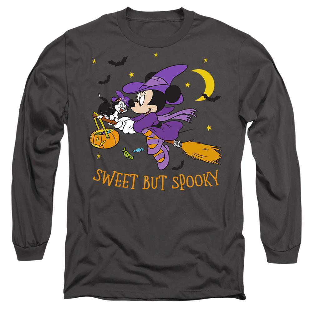 Dieses Langarm-T-Shirt zeigt eine verspielte Grafik von Minnie Maus, die als Hexe auf einem Besen mit einer schwarzen Katze fliegt. Das Design ist perfekt für Halloween oder für alle, die einen Hauch von gruseligem Spass mögen.