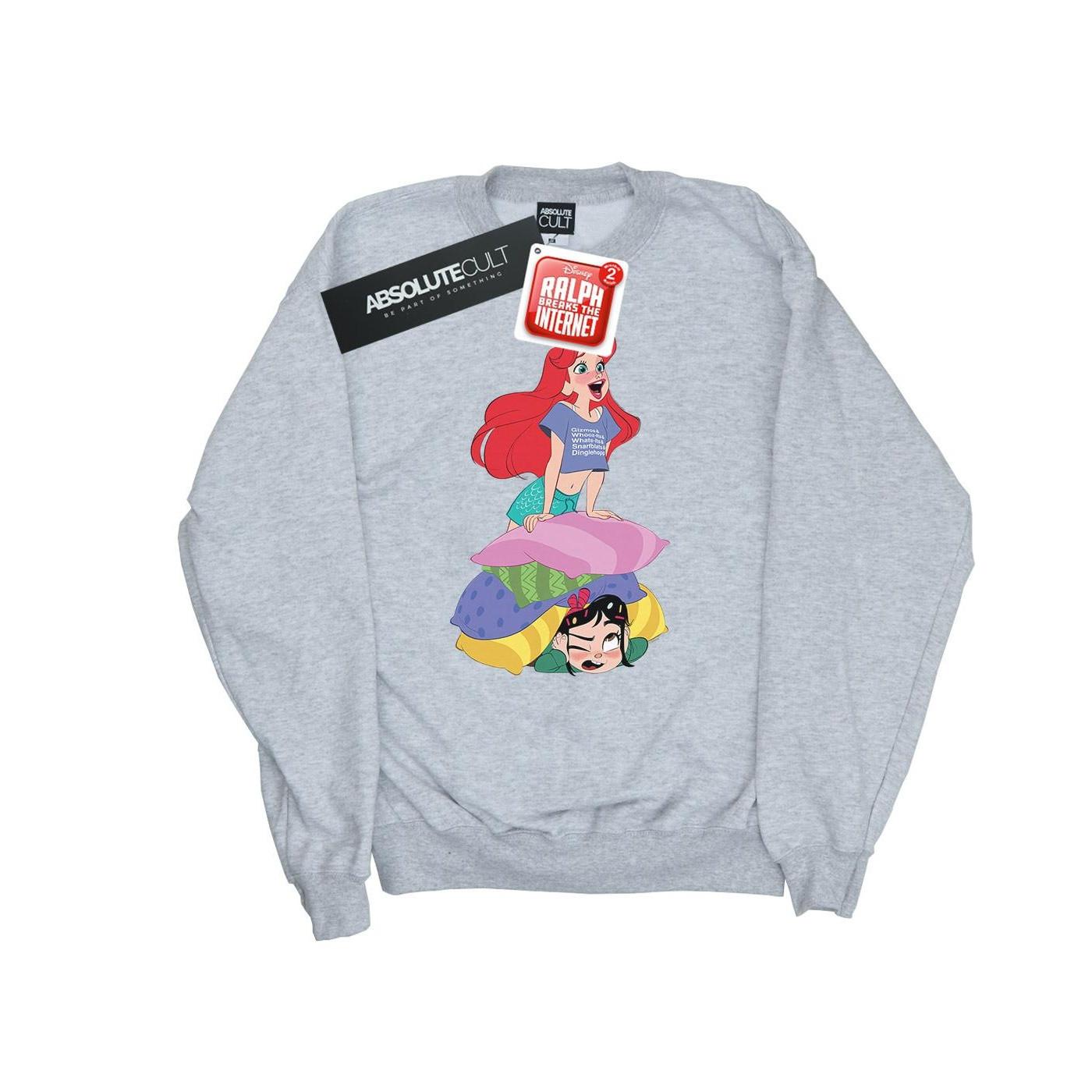 Dieses Sweatshirt zeigt einen lustigen Grafikdruck, der vom Film Wreck-It Ralph inspiriert ist. Das Design zeigt Arielle aus Die kleine Meerjungfrau, die auf einem Kissenstapel sitzt, während Vanellope von Schweetz aus Wreck-It Ralph darunter hervorlugt. Dieses Sweatshirt ist eine bequeme und stilvolle Ergänzung für die Garderobe jedes Fans.