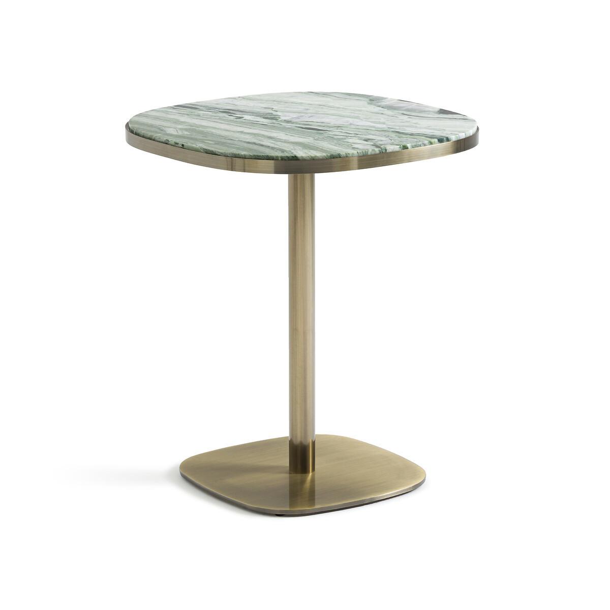 Der legendäre Bistro-Tisch präsentiert sich hier in einer modernisierten Version mit abgerundeter Platte aus grünem Marmor und einem altmessingfarbenen Fuss.