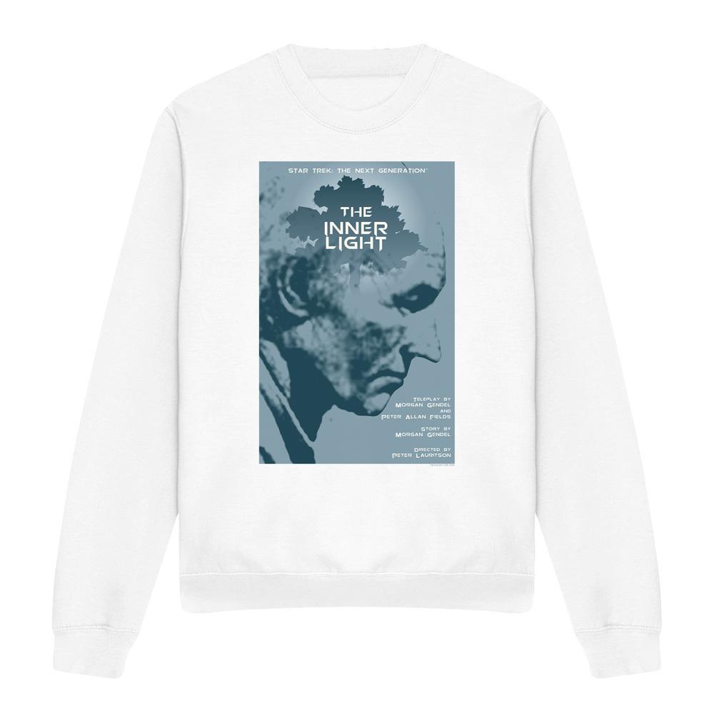 Dieses Sweatshirt zeigt einen einzigartigen Grafikdruck, inspiriert von "Star Trek: The Next Generation" Staffel 5 Episode 25, "Das innere Licht". Das Design präsentiert ein stilisiertes Bild mit Textdetails aus der Episode und ist somit ein unverwechselbares Stück für Fans.