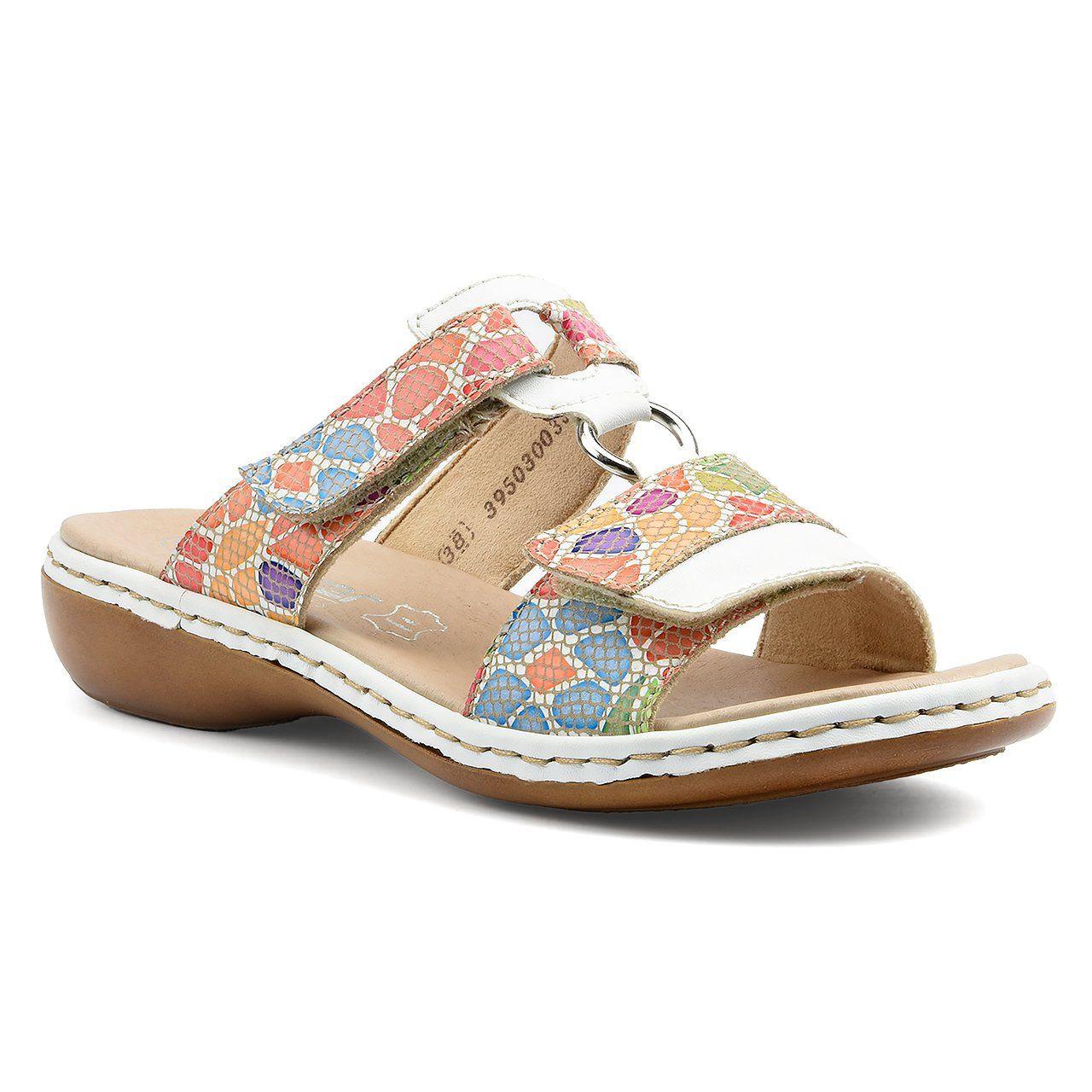 Die 659X6 Sandalen sind in mehreren Farben erhältlich, mit bunten geometrischen Mustern auf dem Riemen in Orange, Blau, Lila und Grün, sowie weissen Akzenten. Der vordere Schnallenverschluss ermöglicht eine einfache Verstellbarkeit. Diese Sandalen sind ideal für den Sommer, mit einem 25 mm Keilabsatz und einer synthetischen Sohle für ein Gefühl von Komfort und Leichtigkeit.