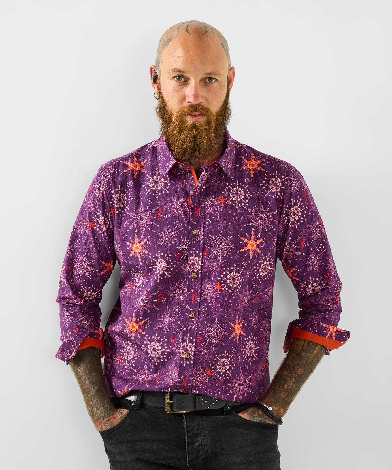 Dieses Hemd mit lebhaftem Schneeflockenmuster ist eine unverwechselbare Ergänzung für jede Garderobe. Das Design umfasst einen klassischen Kragen und eine Knopfleiste, die einen zeitlosen und doch ausdrucksstarken Stil bieten.