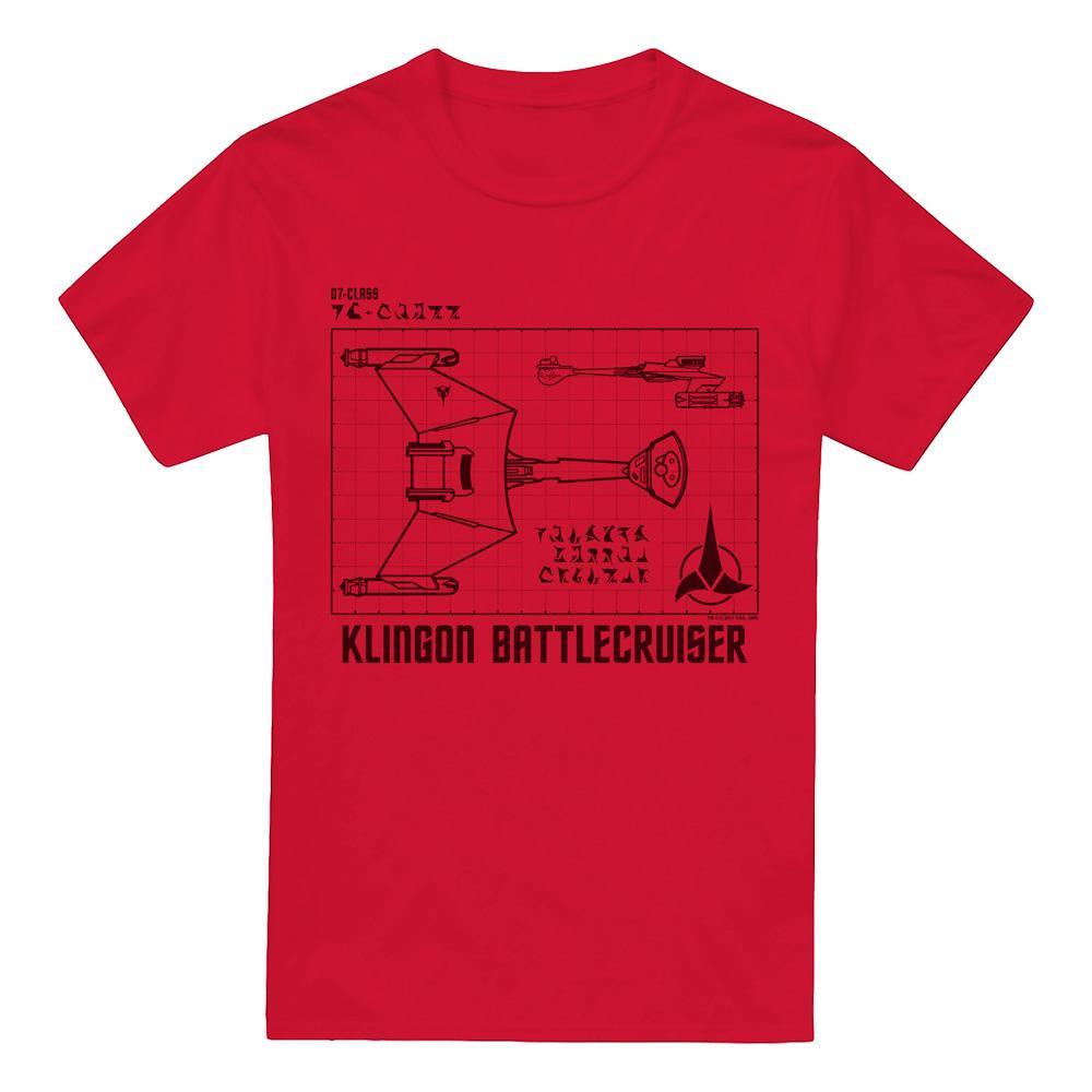 Dieses T-Shirt zeigt einen grafischen Druck eines klingonischen Schlachtkreuzer-Bauplans. Das Design umfasst technische Spezifikationen und das klingonische Emblem, was es zu einem unverwechselbaren Stück für Fans macht. Es besteht aus 100% Baumwolle für Komfort und Langlebigkeit.