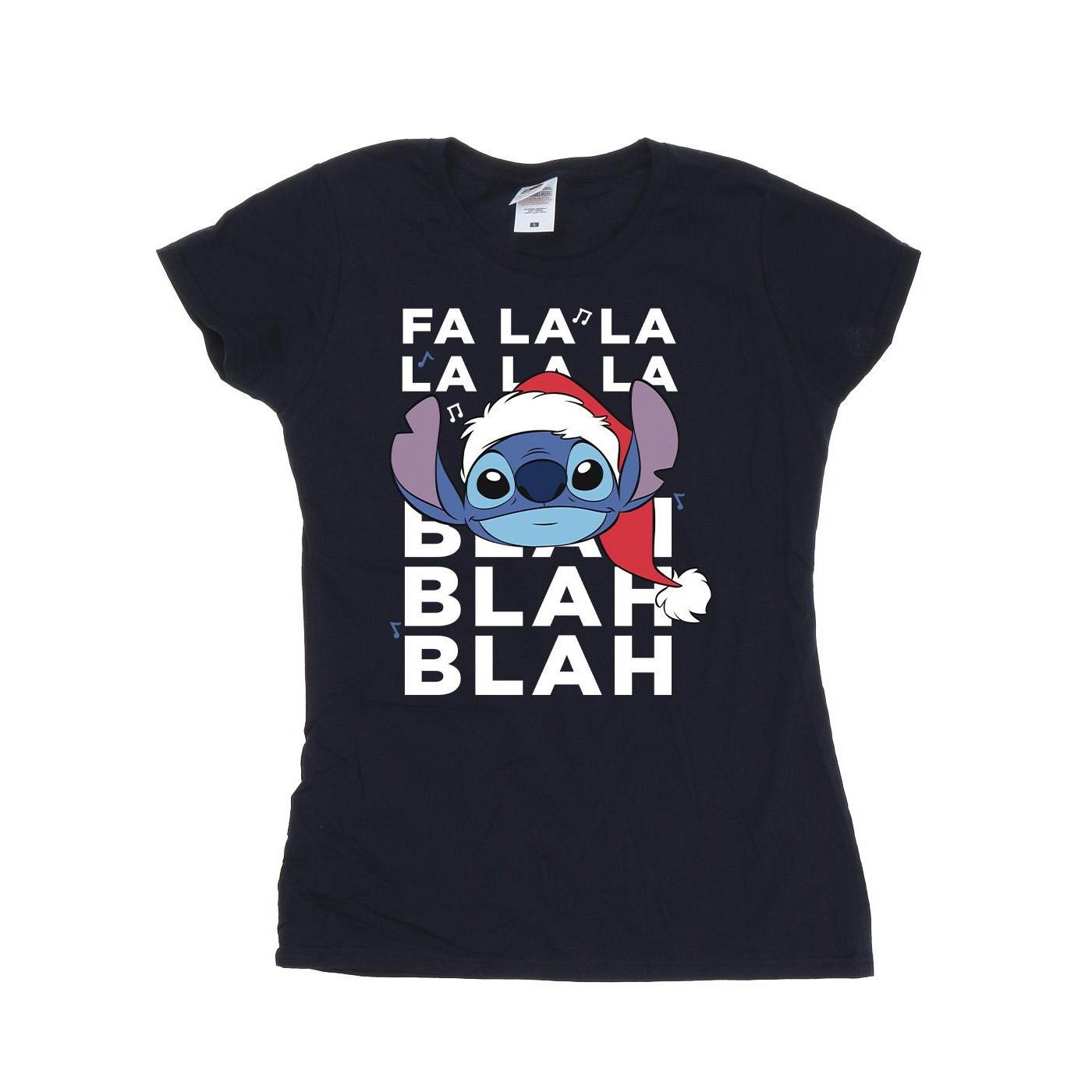 Dieses T-Shirt zeigt einen verspielten Grafikdruck von Stitch mit Weihnachtsmütze, begleitet vom Text "FA LA LA LA LA LA" und "BLAH BLAH BLAH". Es ist eine lustige und lässige Ergänzung für jede Garderobe.