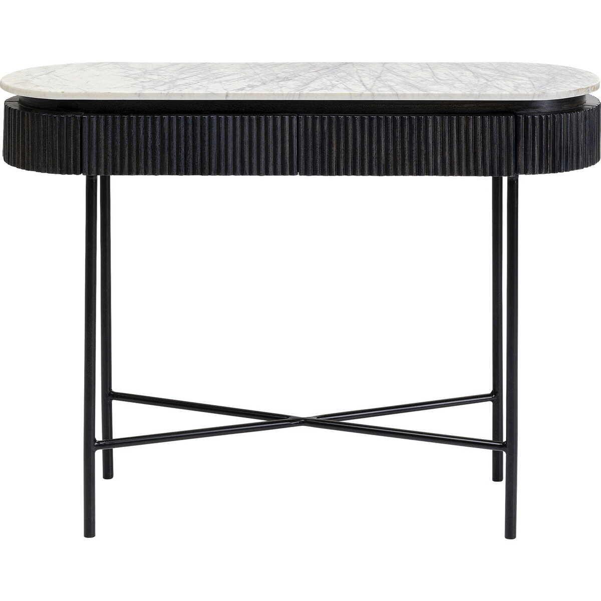 Edel und besonders diese Flurkonsole will mehr. Die Form: ein flaches Oval, die Abstellfläche aus hellem, echtem Marmor und ein Korpus, der mit dunkelgrauen Fronten und Seiten aus Massivholz in Riffeloptik unter den Konsolentischen heraussticht. Glenn strahlt diskrete Noblesse und zeitlose Eleganz aus und überzeugt durch wertvolle Materialien.Spielt mit dem Schwarz-Weiss-Kontrast: elegante Flurkonsole mit heller Marmorplatte und dunkelgrauem Massivholz-Korpus auf filigranem Stahlgestell in SchwarzMit der ovalen Form und den vertikal strukturierten Fronten ist dieser Konsolentisch ein Meisterwerk an grafischem MöbeldesignZwei Schubladen mit verdeckten Griffmulden an der Oberkante bieten grosszügigen StauraumDarf auch als Laptop-Tisch für das Wohnzimmer zweckentfremdet werden. Im Homeoffice finden hier Akten, iPad und die Ladestationen PlatzLässt sich mit Glas und Deko in Schwarz und Weiss kühl stylen, mit Gold glamourösProduktinformation Tischplatte: Marmor, Schubladenkorpus: mitteldichte Faserplatte lackiert, Fuss: Stahl pulverbeschichtet, Schubladenfront: Mango Massivholz lackiert, 20 kg max. Belastbarkeit, Lieferung zerlegt