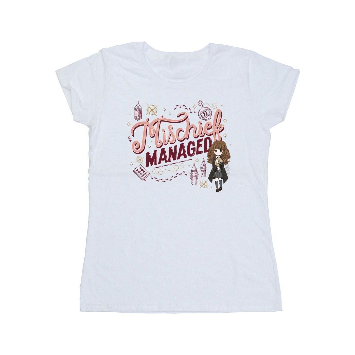 Dieses T-Shirt zeigt eine verspielte Grafik, inspiriert von der magischen Welt von Harry Potter. Das Design beinhaltet den Satz „Mischief Managed“ in einer stilisierten Schrift, begleitet von einer Illustration eines Charakters und verschiedenen magischen Elementen wie Hogwarts Schloss und Fussabdrücken, die an die Karte des Rumtreibers erinnern.