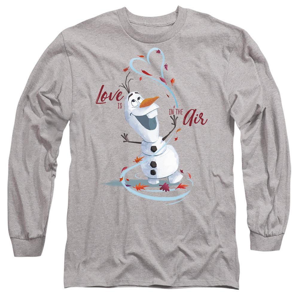 Dieses T-Shirt zeigt eine verspielte Grafik von Olaf aus Disneys Frozen, umgeben von wirbelnden Blättern und einer herzförmigen Brise. Der Text „Love Is In The Air“ ist prominent platziert und macht es zu einer charmanten Wahl für verschiedene Anlässe.