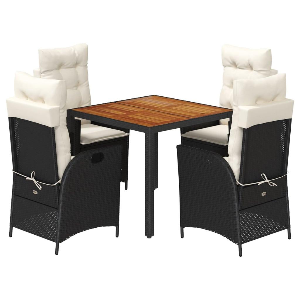 Diese Garten-Essgruppe ist eine ideale Wahl für Mahlzeiten im Freien oder einfach nur zum Entspannen im Garten, Hinterhof oder auf der Terrasse. Langlebiges Material: PE-Rattan, auch als Poly Rattan bekannt, ist ein robustes, pflegeleichtes synthetisches Material, das die Optik von natürlichem Rattan aufweist. Es kennzeichnet sich durch ein geringes Eigengewicht und lässt sich einfach reinigen. Aufgrund seiner Haltbarkeit und Witterungsbeständigkeit wird es häufig bei der Herstellung von Gartenmöbeln verwendet.Verstellbare Rückenlehne: Der Gartensessel ist mit einem Griff versehen. So kannst du die Rückenlehne durch Ziehen des Griffs verstellen und sie danach schnell wieder in ihre ursprüngliche Position bringen.Bequemes Sitzerlebnis: Dieser Gartensessel mit dick gepolsterten Kissen bietet ein angenehmes Sitzgefühl.Abnehmbarer und waschbarer Bezug: Die Sitzkissen verfügen über abnehmbare Bezüge, die sich ganz einfach waschen und reinigen lassen. Dank der Klappen an der Rückseite können die Rückenkissen ganz einfach an den Rückenlehnen befestigt werden.Stabile und pflegeleichte Tischplatte: Dieser Gartentisch besitzt eine Tischplatte aus Akazienholz, die robust und langlebig ist und sich leicht mit einem feuchten Tuch reinigen lässt. Gut zu wissen: Wir empfehlen dir, deine Gartenmöbel mit einer wasserdichten Hülle zu schützen, um lange Zeit eine ansprechende Optik aufzuweisen.Maximale Tragfähigkeit (pro Sitz ): 110 kgUV-beständigZusammenbau erforderlich: JaTisch:Farbe: SchwarzMaterial: PE-Rattan, pulverbeschichteter Stahl, massives Akazienholz mit ÖlfinishAbmessungen: 90 x 90 x 75 cm (L x B x H)Garten-Relaxsessel:Farbe: SchwarzMaterial: PE-Rattan, pulverbeschichteter StahlAbmessungen in Sitzposition: 57 x 61 x 93 cm (B x T x H)Abmessungen in Liegeposition: 57 x 86 x 83 cm (B x T x H)Sitzgröße: 47 x 50 cm (B x T)Sitzhöhe vom Boden: 44 cmArmlehnenhöhe vom Boden: 64 cmKissen:Farbe: CremeweißBezugsmaterial: Stoff (100% Polyester)Füllmaterial des Sitzkissen: SchaumstoffFüllmaterial des Rückenkissens: BaumwollfaserAbmessungen des Sitzkissens: 48 x 51 x 3 cm (B x T x H)Abmessungen des Rückenkissens: 66 x 48 x 11 cm (L x B x T)Lieferung umfasst:1 x Gartentisch4 x Verstellbarer Gartenstuhl4 x Rückenkissen4 x Sitzkissen mit abnehmbarem und waschbarem Bezug