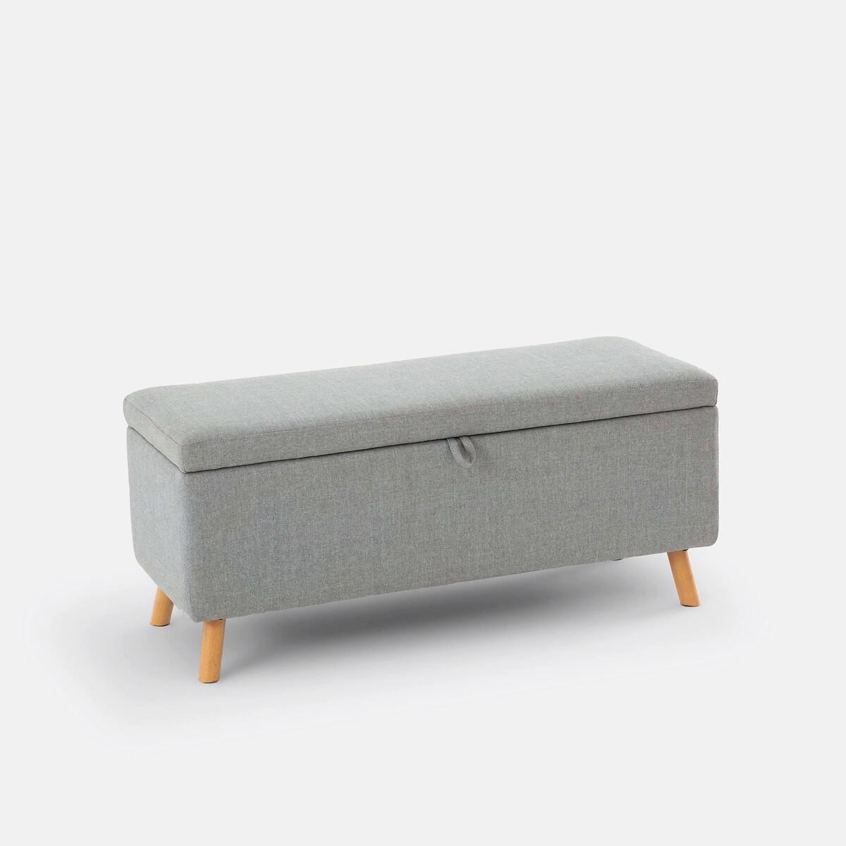 Bettbank Jimi. Diese im schlichten skandinavischen Design gehaltene Bettbank bietet ausreichend Platz für zusätzliche Decken und Kissen. Die gepolsterte Oberseite fungiert als bequeme Sitzfläche.