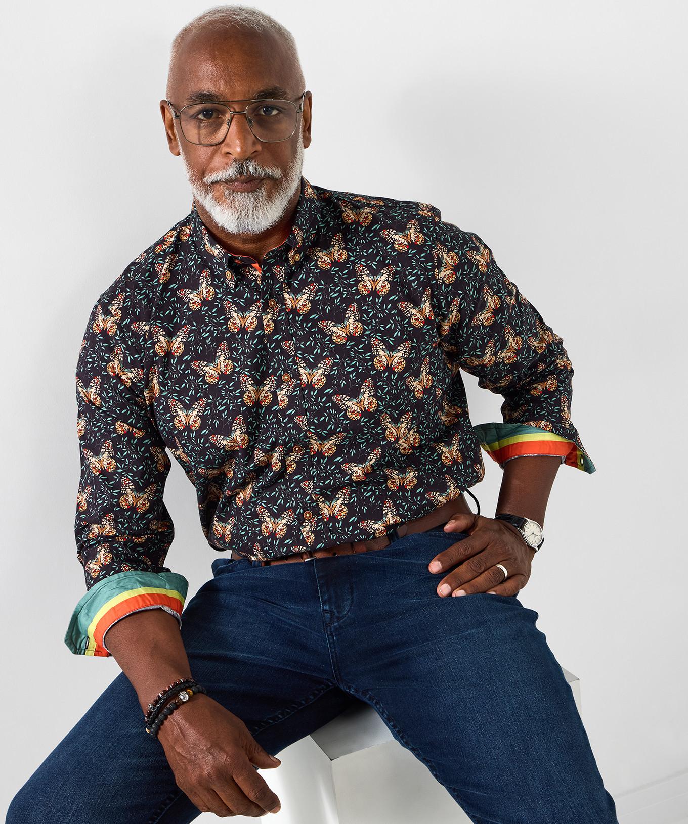 Dieses Langarmhemd mit lebhaftem Schmetterlingsmotiv verleiht jeder Garderobe eine unverwechselbare Note. Das Design umfasst einen klassischen Kragen und eine durchgehende Knopfleiste für ein gepflegtes Erscheinungsbild. Die Manschetten sind mit einem kontrastierenden farbigen Futter versehen, das beim Hochkrempeln sichtbar wird und ein verspieltes Detail bietet.