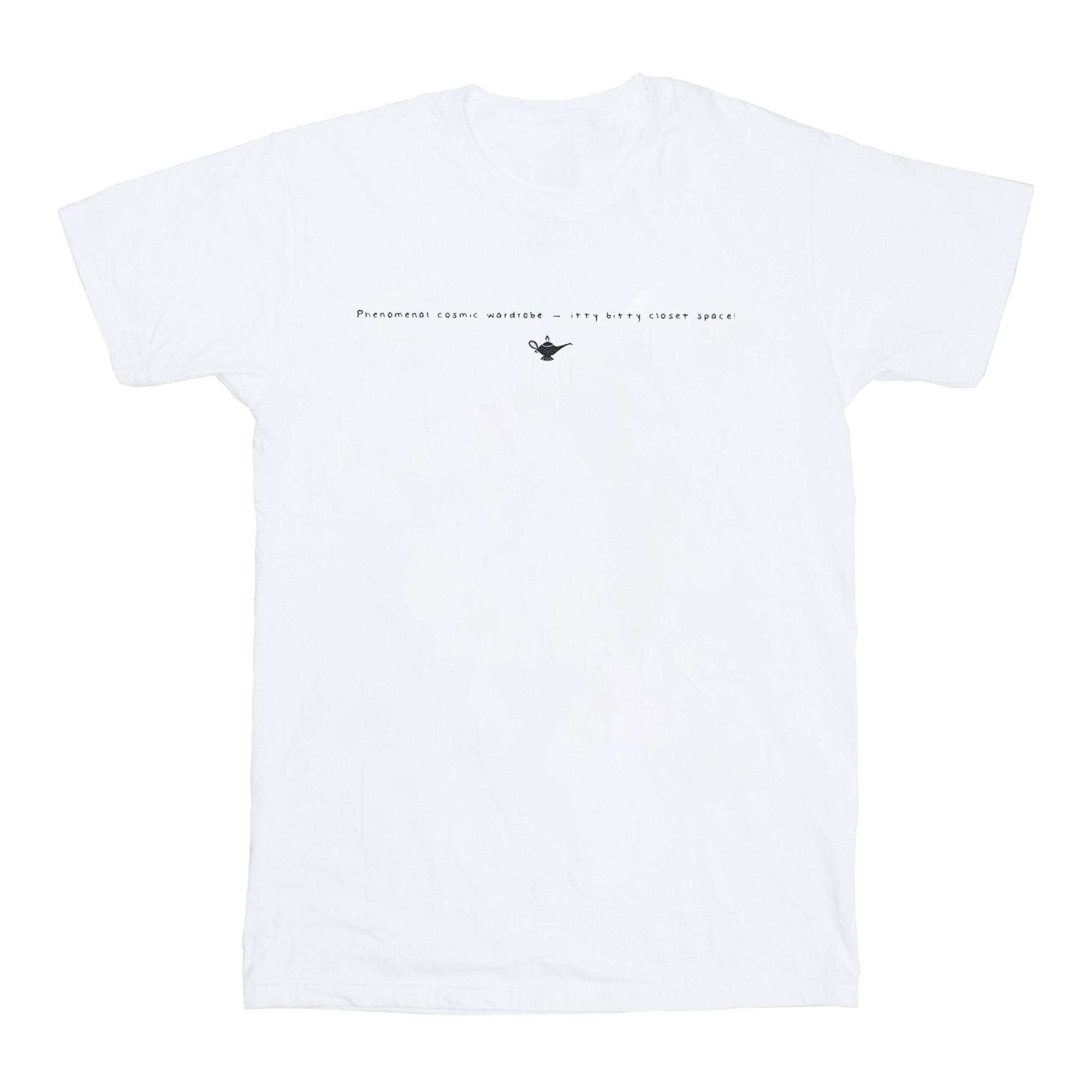 Dieses T-Shirt verfügt über einen einzigartigen Grafikdruck, der jedem Outfit eine persönliche Note verleiht. Das Design enthält den Text «Phenomenal cosmic wardrobe - itty bitty closet space!» zusammen mit einer kleinen Wunderlampen-Illustration, die eine spielerische und fantasievolle Ästhetik bietet. Hergestellt aus ringgesponnener Baumwolle, bietet es ein superweiches Gefühl und eine bequeme normale Passform.