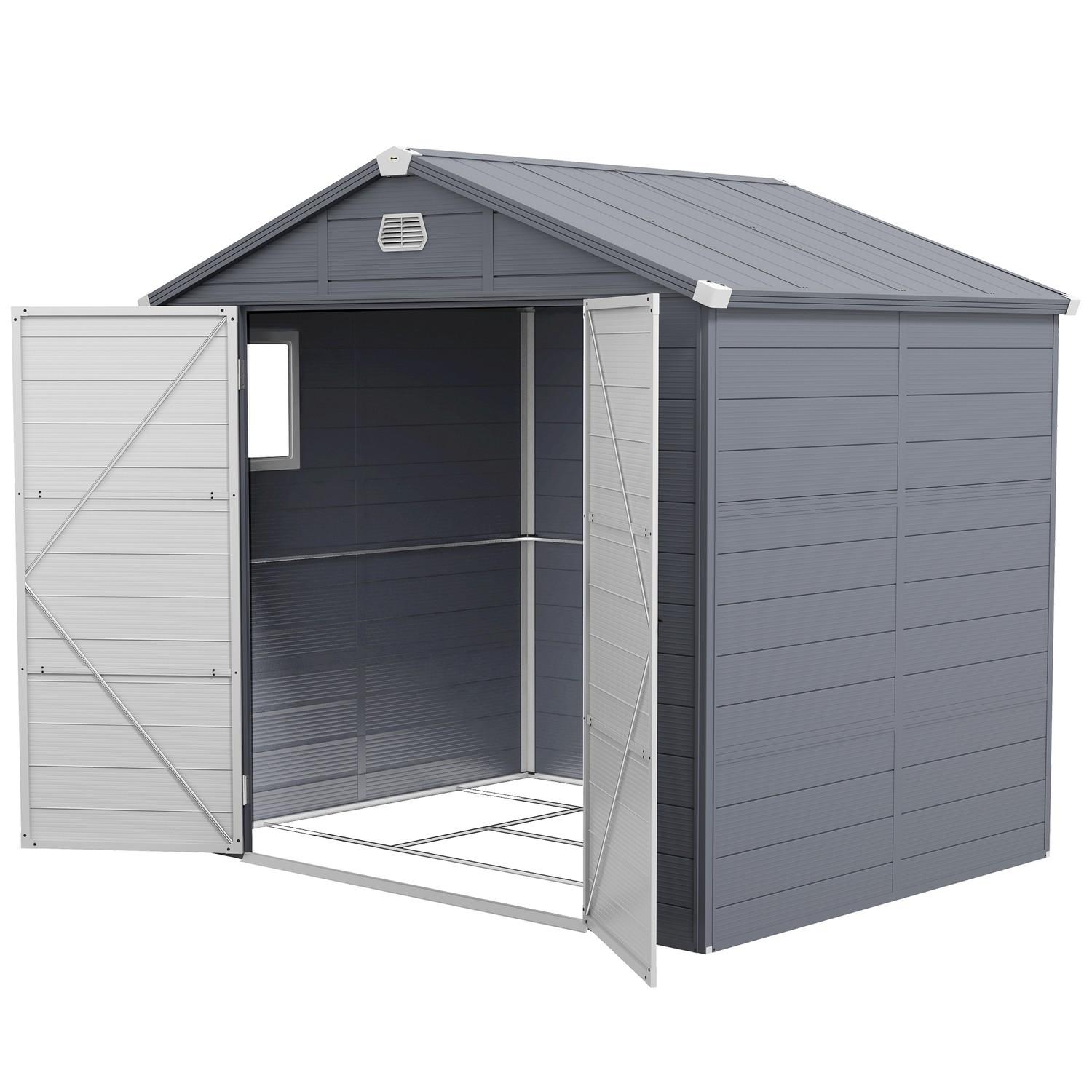 Belüftungsöffnungen sind strategisch platziert, um die Luftzirkulation zu fördern und die Ansammlung von Feuchtigkeit und Schimmel im Schuppen zu verhindern. Darüber hinaus erhöht das Seitenfenster die Helligkeit im Innenraum, sodass Sie ohne zusätzliche Beleuchtung leichter finden, was Sie brauchen. Dieser Gartenschuppen ist nicht nur praktisch, sondern auch ästhetisch ansprechend, mit einer eleganten grauen Oberfläche, die zu jedem Außenbereich passt.