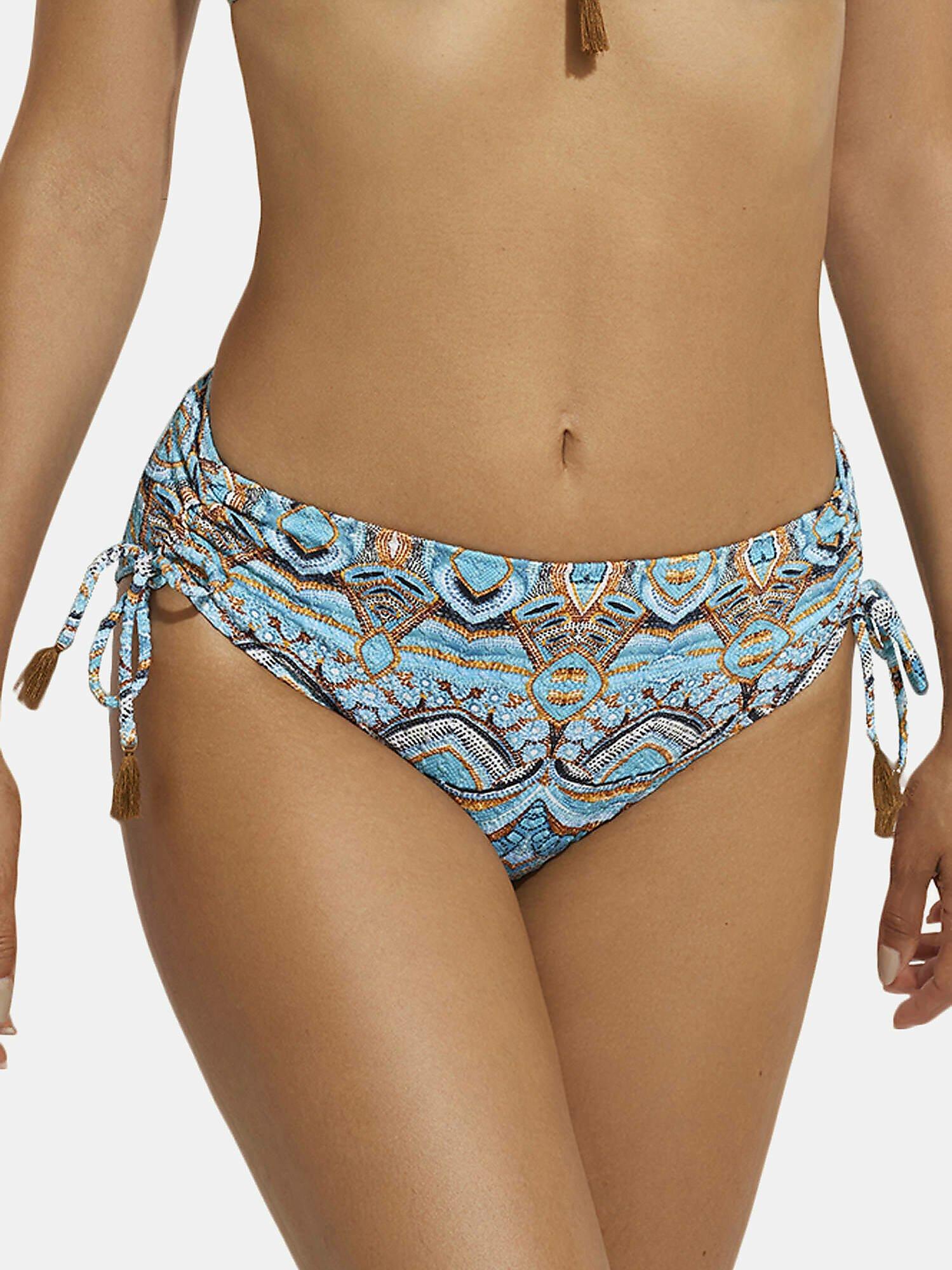 Diese hochgeschnittenen Bikini-Strümpfe aus der Mai Thai Kollektion bieten einen klassischen Schnitt, der Komfort und eine schmeichelhafte Passform für den Strand gewährleistet. Die hohe Taille stützt den Bauch sanft, während die Seiten mit Pampelmusenbändern verstellbar sind, was einen individuellen Stil an den Hüften ermöglicht. Der leuchtende Ethno-Print erinnert an die Strände der polynesischen Inseln. Ein kleines goldenes Logo befindet sich auf der Rückseite.