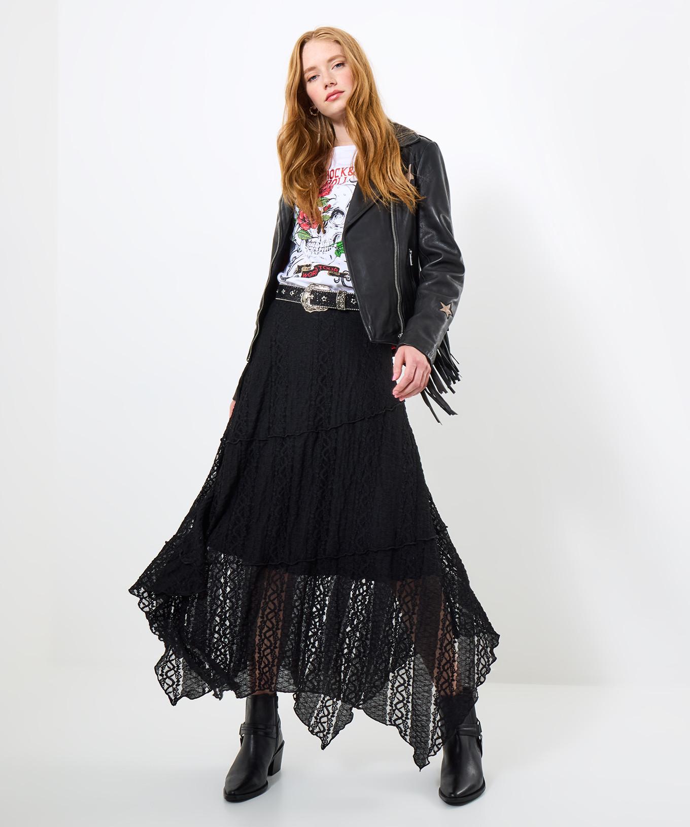 Dieser schwarze Spitzen-Maxirock verfügt über einen stilvollen High-Low-Saum, der eine moderne und elegante Silhouette bietet. Die aufwendigen Spitzendetails verleihen einen Hauch von Raffinesse und machen ihn zu einem vielseitigen Kleidungsstück für verschiedene Anlässe.
