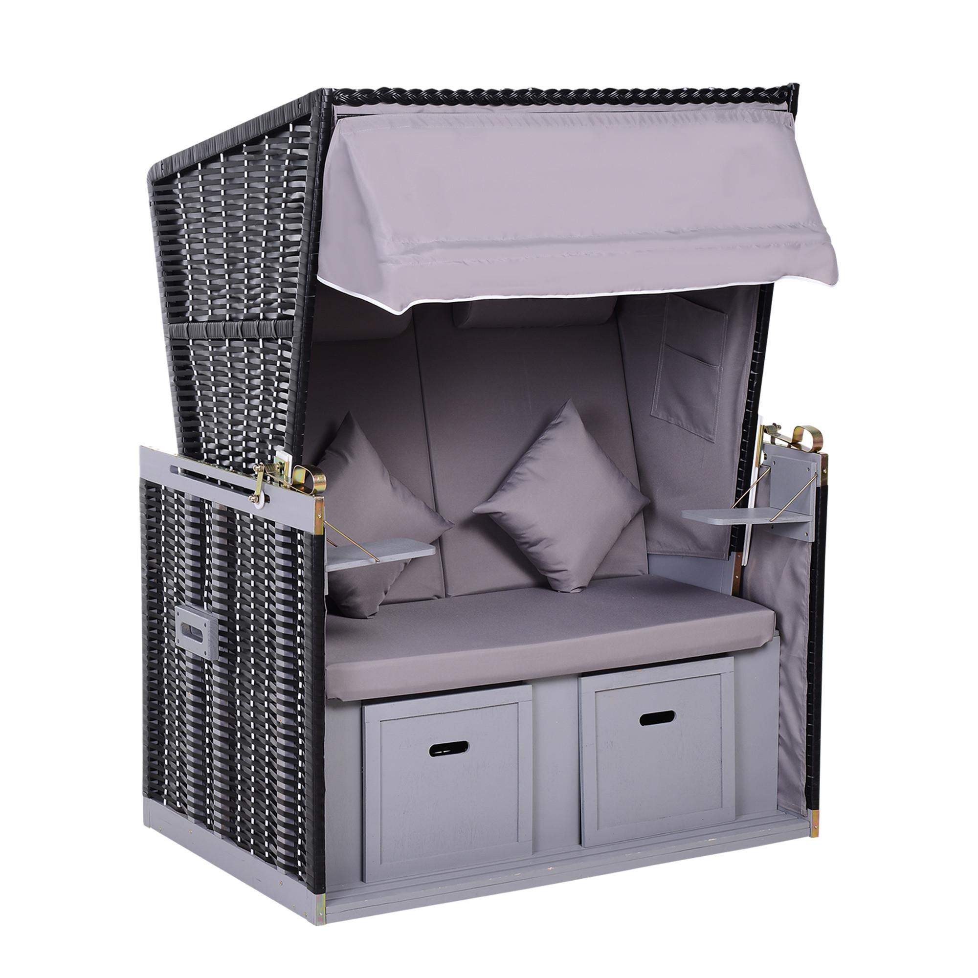 Schick und gemütlich zugleich: Der Strandkorb für zwei Personen ist ein echter Hingucker. Er macht sich ebenso gut auf der Terrasse wie im Garten und bietet Ihnen alles, was Sie von Strandkörben im Urlaub kennen: zwei praktische Klapptische, ausziehbare Fußstützen, ein Sonnendach zum Herunterklappen und die mehrstufig verstellbare Rückenlehne. Unser Plus: praktische Taschen an den Innenseiten, in denen Sie zum Beispiel Zeitschriften aufbewahren können. Damit holen Sie sich echtes Strand- und Urlaubs-Feeling ganz einfach nach Hause.