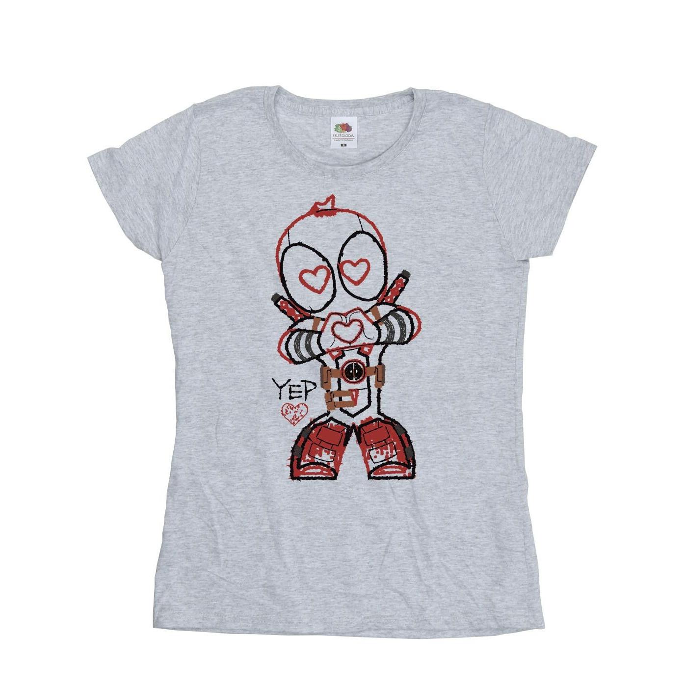 Dieses T-Shirt zeigt einen verspielten Grafikdruck von Deadpool und ist eine lustige Ergänzung für jede Freizeitgarderobe. Das Design präsentiert Deadpool in einer stilisierten, niedlichen Form, komplett mit herzförmigen Augen und einer Herzgeste, zusammen mit dem Wort „YEP“.