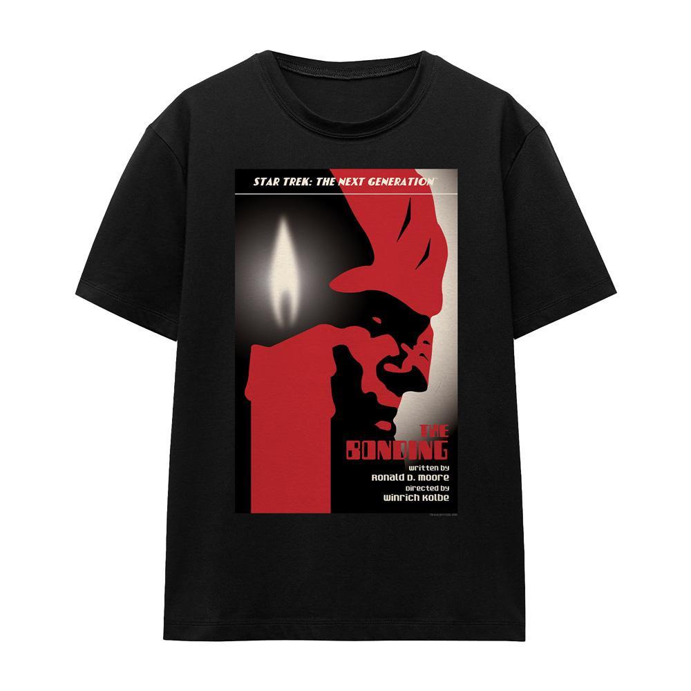 Dieses T-Shirt zeigt einen Grafikdruck, inspiriert von "Star Trek: The Next Generation" Staffel 3 Episode 5, mit dem Titel "The Bonding". Das Design präsentiert eine stilisierte Darstellung von Charakteren und Elementen aus der Episode und ist somit ein unverwechselbares Stück für Fans.