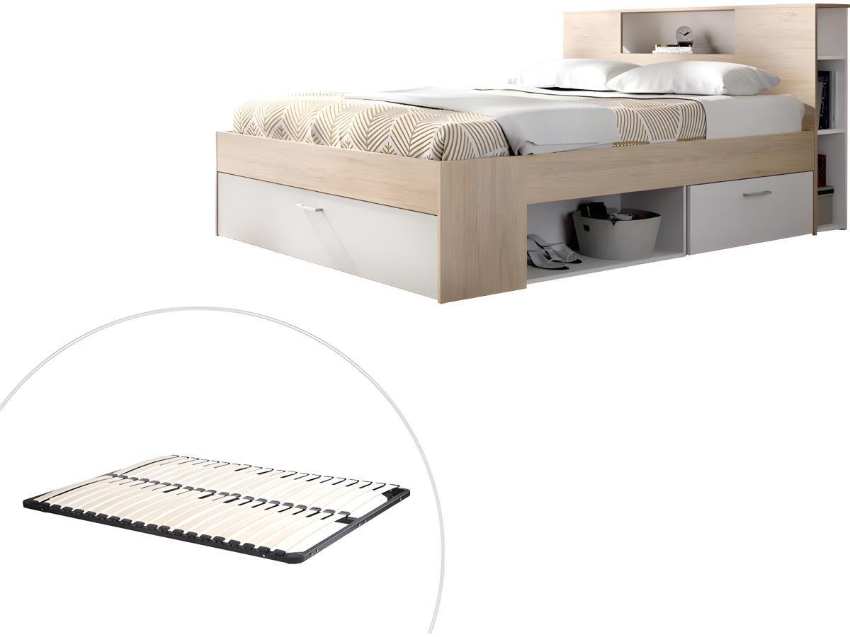 Vente-unique, Bett mit Stauraum & Schubladen + Lattenrost - 160 x 200 cm - Weiß & Naturfarben - LEANDRE