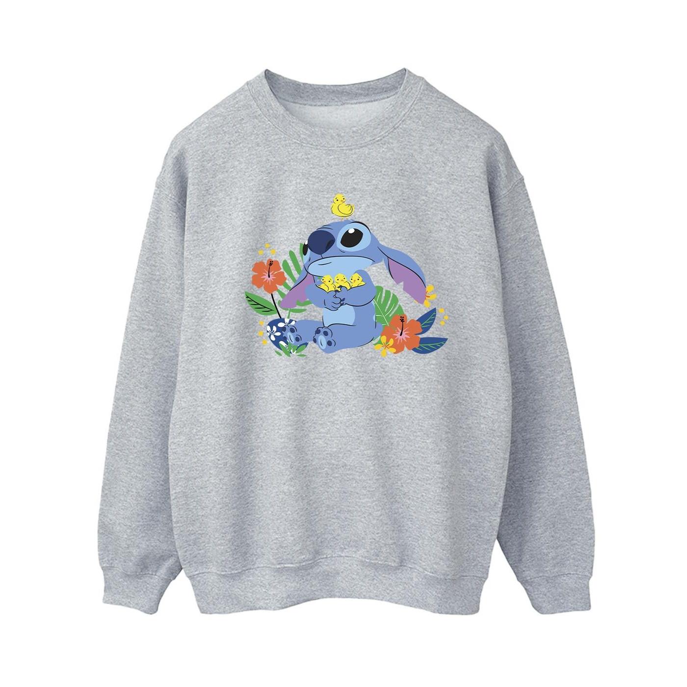 Dieses bequeme Sweatshirt zeigt einen charmanten Grafik-Print von Stitch, umgeben von tropischen Blumen und kleinen gelben Vögeln haltend, mit einem Entenküken auf dem Kopf. Der Rundhalsausschnitt und die langen Ärmel sorgen für eine klassische und entspannte Passform, die es zu einer vielseitigen Ergänzung für jede Freizeitgarderobe macht.