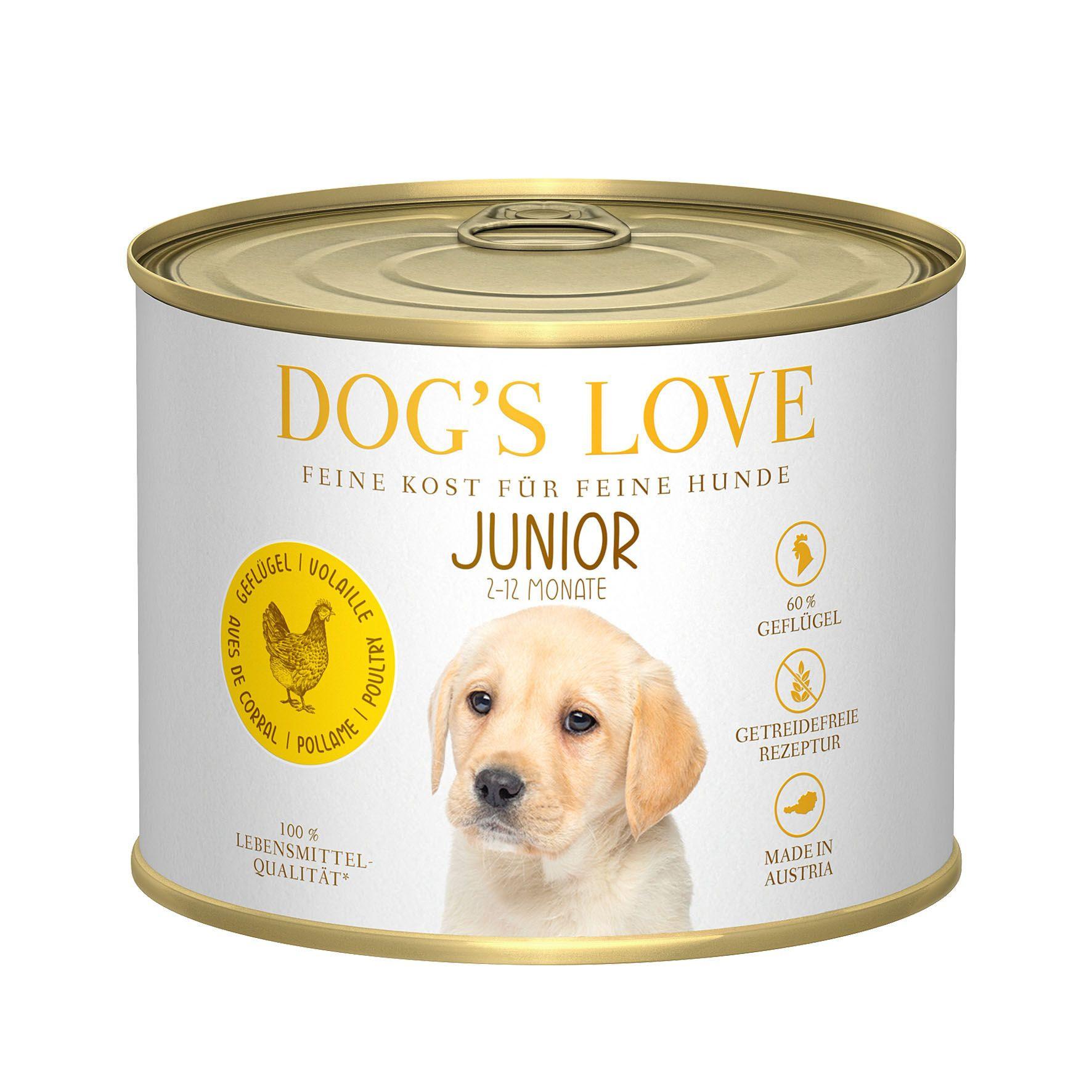 Die natürlichen und artangepassten JUNIOR-Sorten des DOG'S LOVE-Sortiments sind speziell auf die Bedürfnisse von Junghunden im Alter von 6 Wochen bis 12 Monaten abgestimmt. Sie enthalten daher einen erhöhten Nährstoffbedarf, der für Welpen und junge heranwachsende Hunde geeignet ist. So hat Ihr kleiner Vierbeiner einen guten Start in ein langes und vitales Leben.