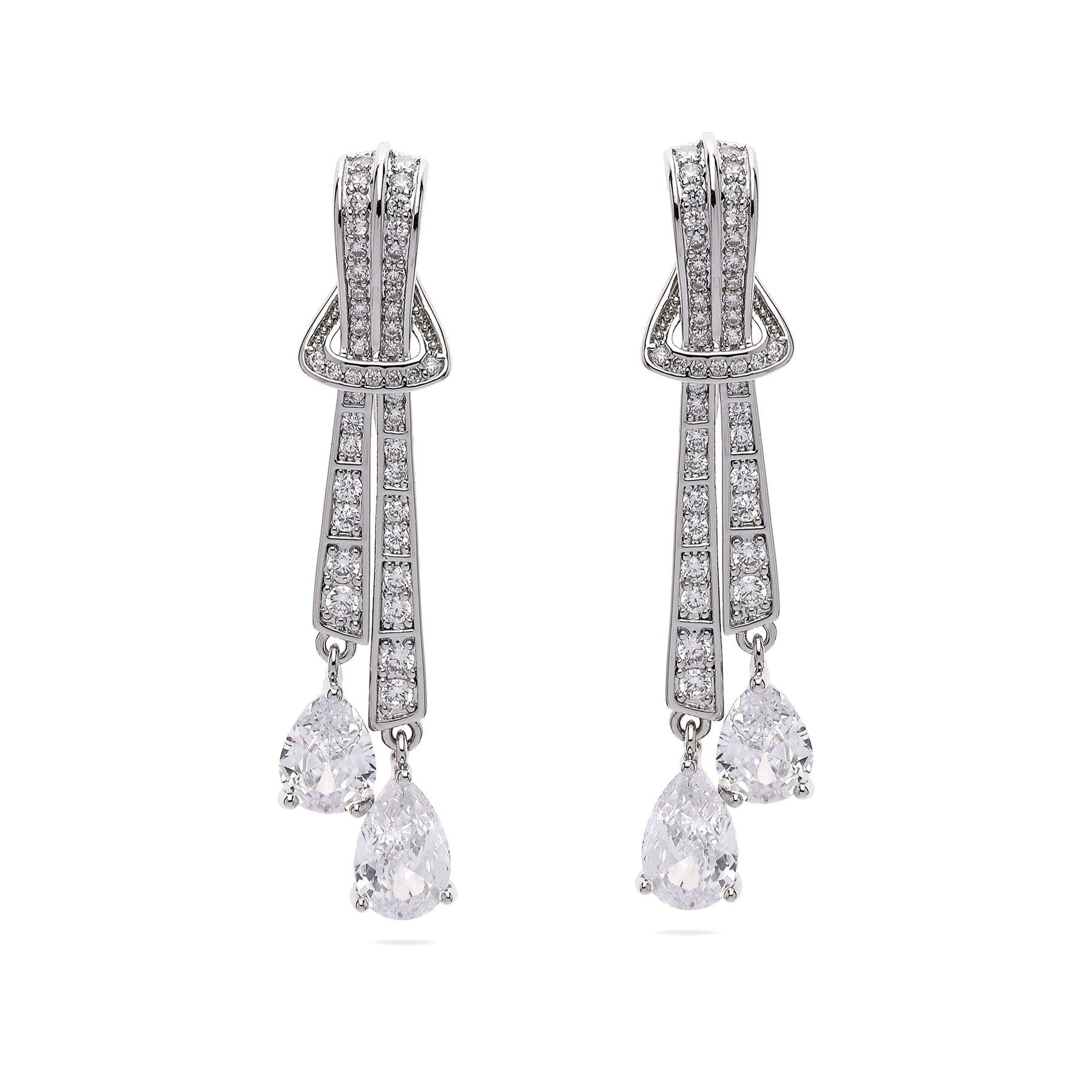 Diese schimmernden Ohrhänger verströmen einen zarten Glanz. Aufwendige, architektonisch anmutende Metallarbeiten, besetzt mit winzigen Kristallen, führen zu drei birnenförmigen Anhängern, die das Licht mit faszinierendem Funkeln einfangen und reflektieren. Sie verströmen einen Hauch von Vintage-Glamour, neu interpretiert für moderne Eleganz, und verleihen jedem Look mit ihrem ätherischen Charme das gewisse Etwas. Größe: 0,9 cm x 4,8 cm | Beschichtung: Rhodiumplattiert | Verschluss: Stecker und Rückseite