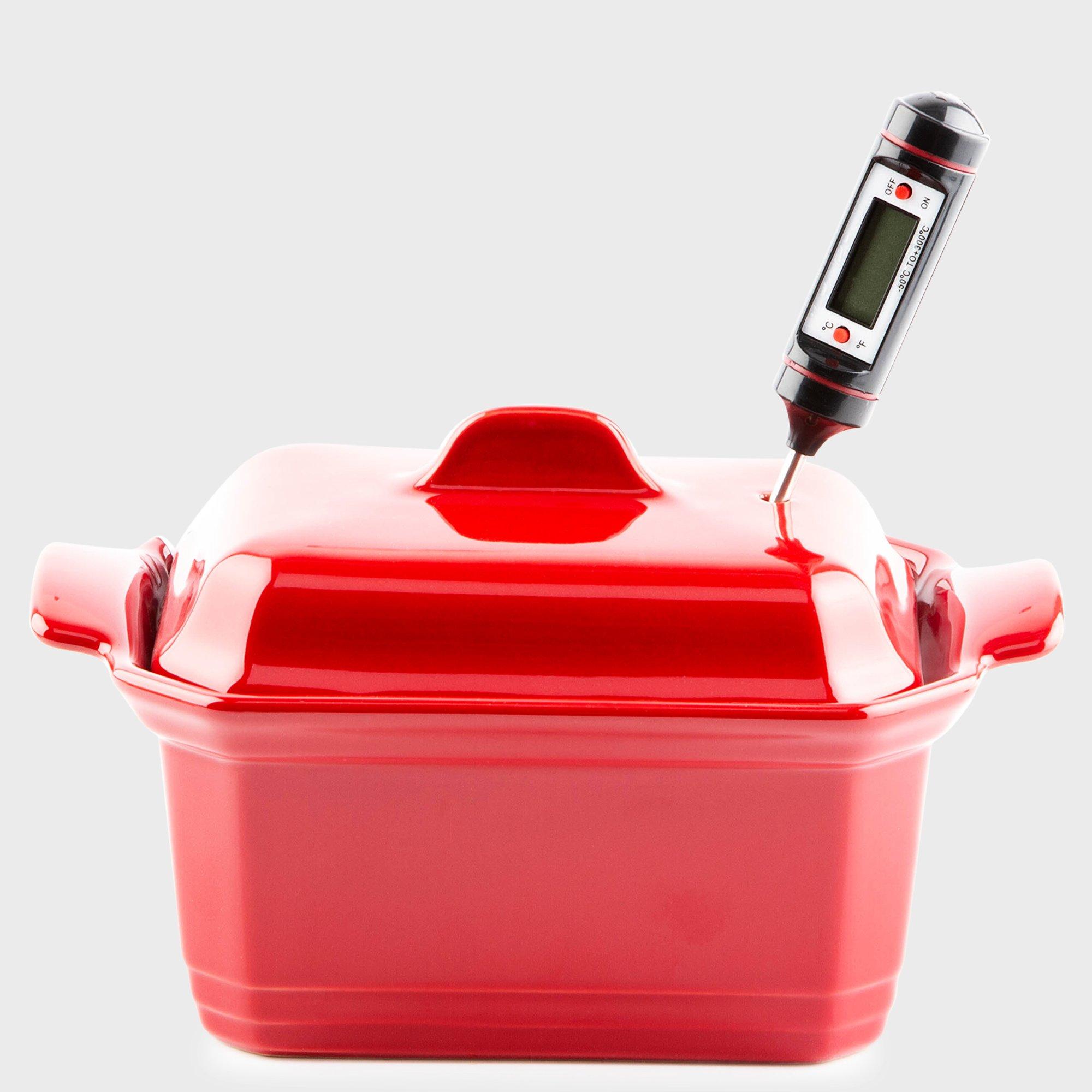 Rote Keramikterrine für Entenleber-Pastete / Foie Gras. Aus hochwertiger feuerfester Keramik mit Presse und Thermometer.