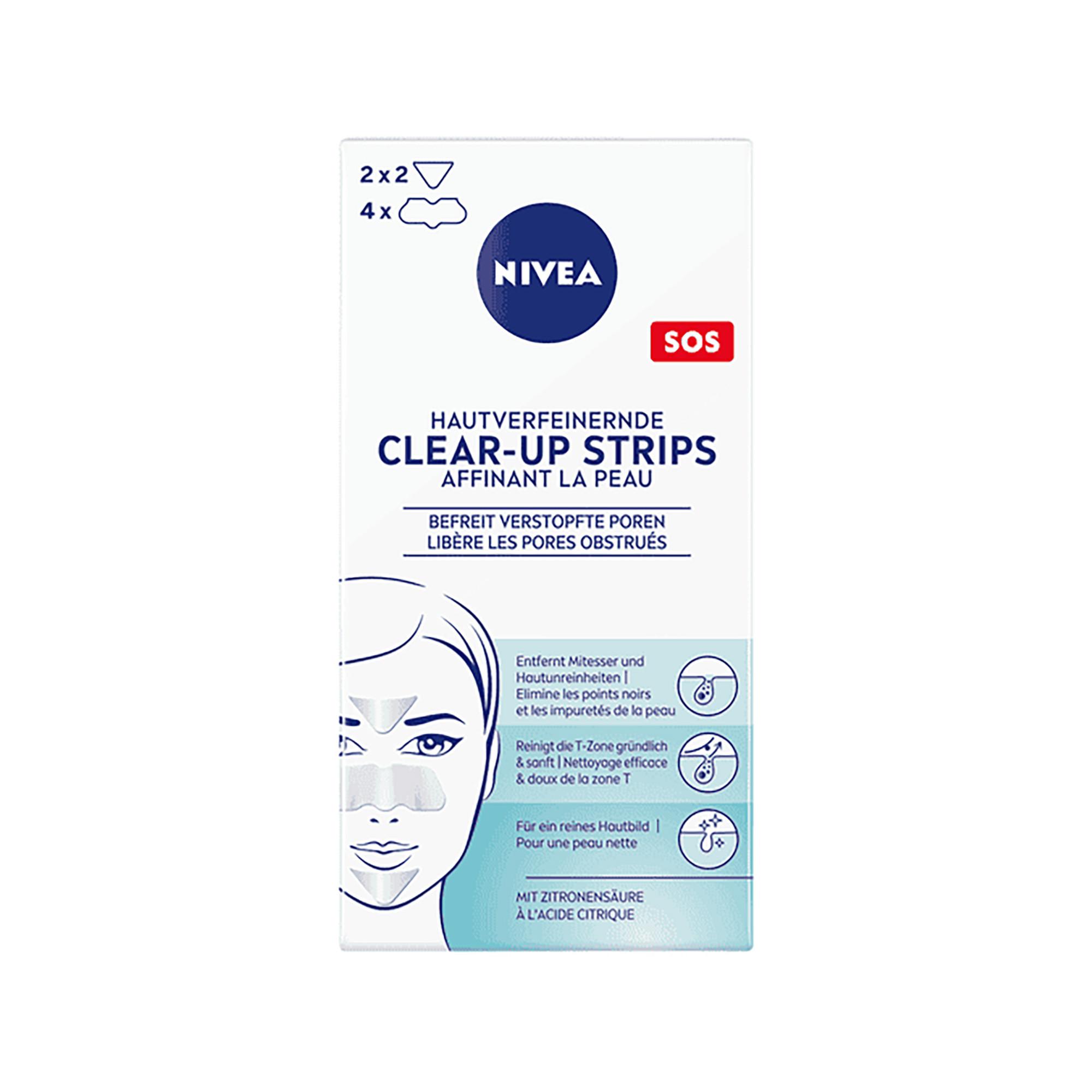Die mit Fruchtsäure angereicherten Clear-Up Strips von Nivea Visage befreien die Poren im Bereich der T-Zone (Nase, Stirn & Kinn) gründlich, schnell und hygienisch von Mitessern und überschüssigem Hautfett. Ein spezieller Wirkstoff verbindet sich mit den Mitessern und Unreinheiten auf der angefeuchteten Haut, welche die Poren verstopfen und zieht diese beim Ablösen heraus. Für alle Hauttypen geeignet.