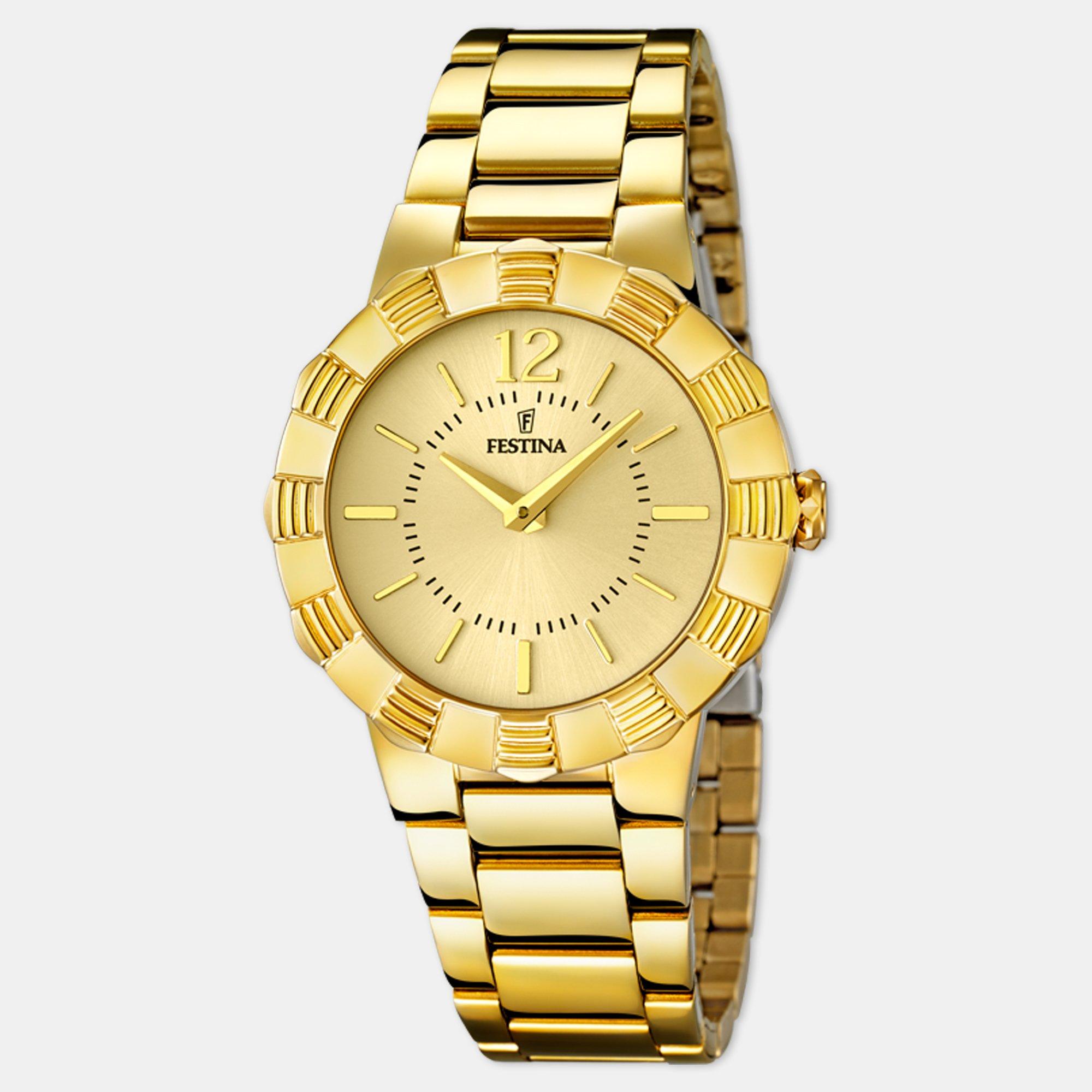 Das Modell Mademoiselle von Festina überzeugt mit seinem goldigen Aussehen. Das robuste Edelstahl-Gehäuse umrahmt ein minimalistisch gehaltenes Ziffernblatt. Die perfekte Uhr für einen extravaganten Look!