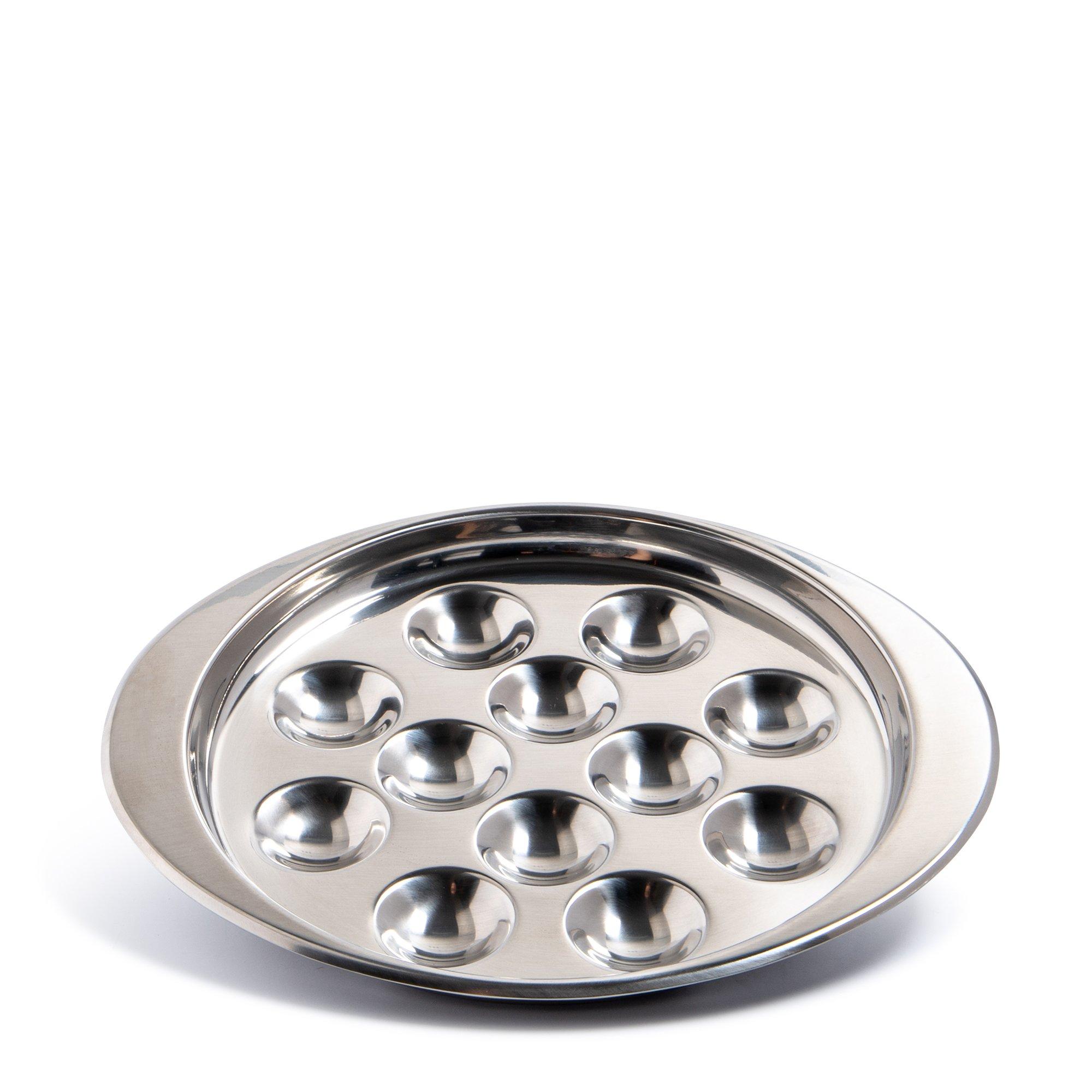Dieser Schneckenteller von MANOR ist aus Metall und hat bewusst eingelassene Wölbungen, damit die Schnecken an Ort und Stelle bleiben. Zusätzlich wird der Tellerrand an zwei Stellen etwas verbreitert damit man ihn besser halten kann.