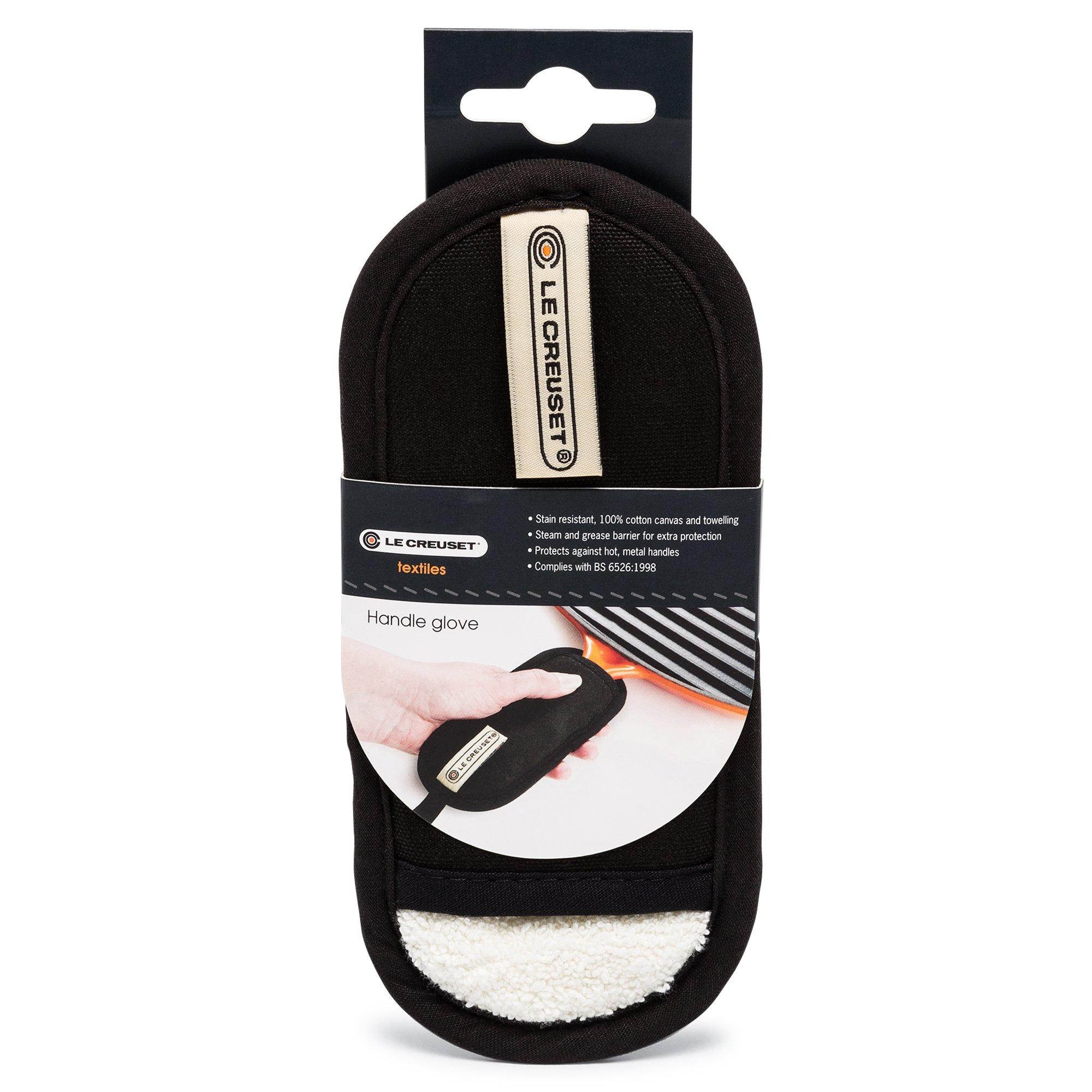 Der Handschutz der französischen Marke Le Creuset wird als Griffüberzug von heissen Metallgriffen verwendet und überzeugt durch eine fleckenabweisende Eigenschaft aufgrund des reinen Baumwollcanvas und der Frottée-Qualität. Das schöne Exemplar dient als Dampf- und Fettsperre und sorgt für zusätzlichen Schutz beim Braten.