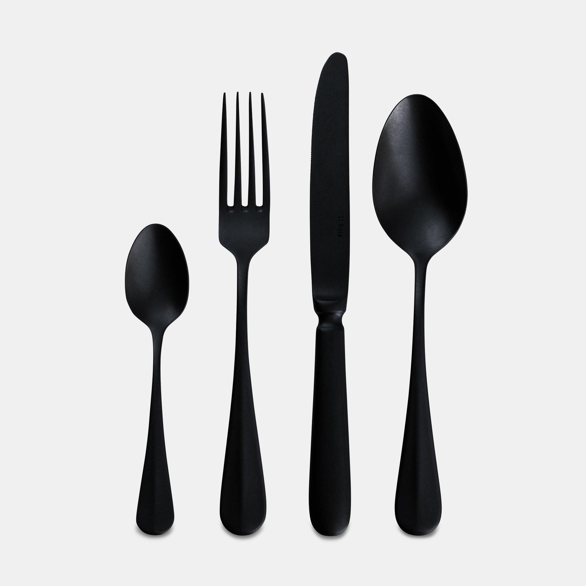 Dieses moderne Besteckset Baguette Vintage Black von Sola besticht durch die Kombination aus eleganten Griff-Formen und der matten Oberfläche in aussergewöhnlichem Schwarz. Das Set besteht aus je sechs rostfreien Esslöffeln, Tafelmessern, Essgabeln und Kaffelöffeln.