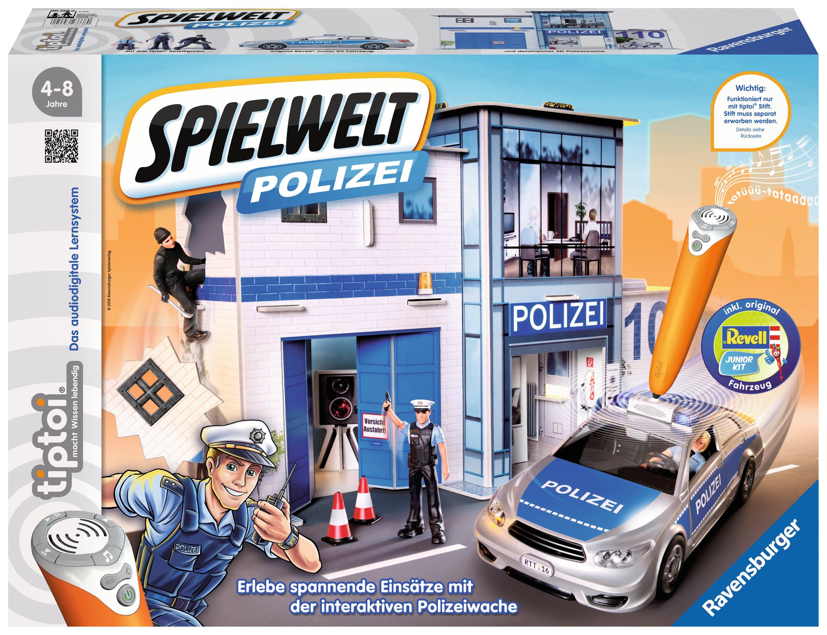 Weitere Produktinformationen: Viele Geräusche, Sachwissen, Geschichten und Spiele Fördert Kreativität und freies Rollenspiel Polizeiauto zum Zusammen- und Auseinanderbauen Spielwelt komplett mit dem tiptoi® Stift bespielbar Haltet den Dieb! Die interaktive Polizei mit Polizeiauto, drei tiptoi® Spielfiguren, großer Wache und Juwelier bietet Kindern eine actionreiche Spielwelt voller Sounds, Spielen und spannendem Wissen. Die Kinder erfahren alles über den Alltag der Polizisten, erleben aufregende Einsätze und wilde Verfolgungsjagden. Denn nur mit Hilfe der Kinder kann der flüchtige Dieb gefasst werden!