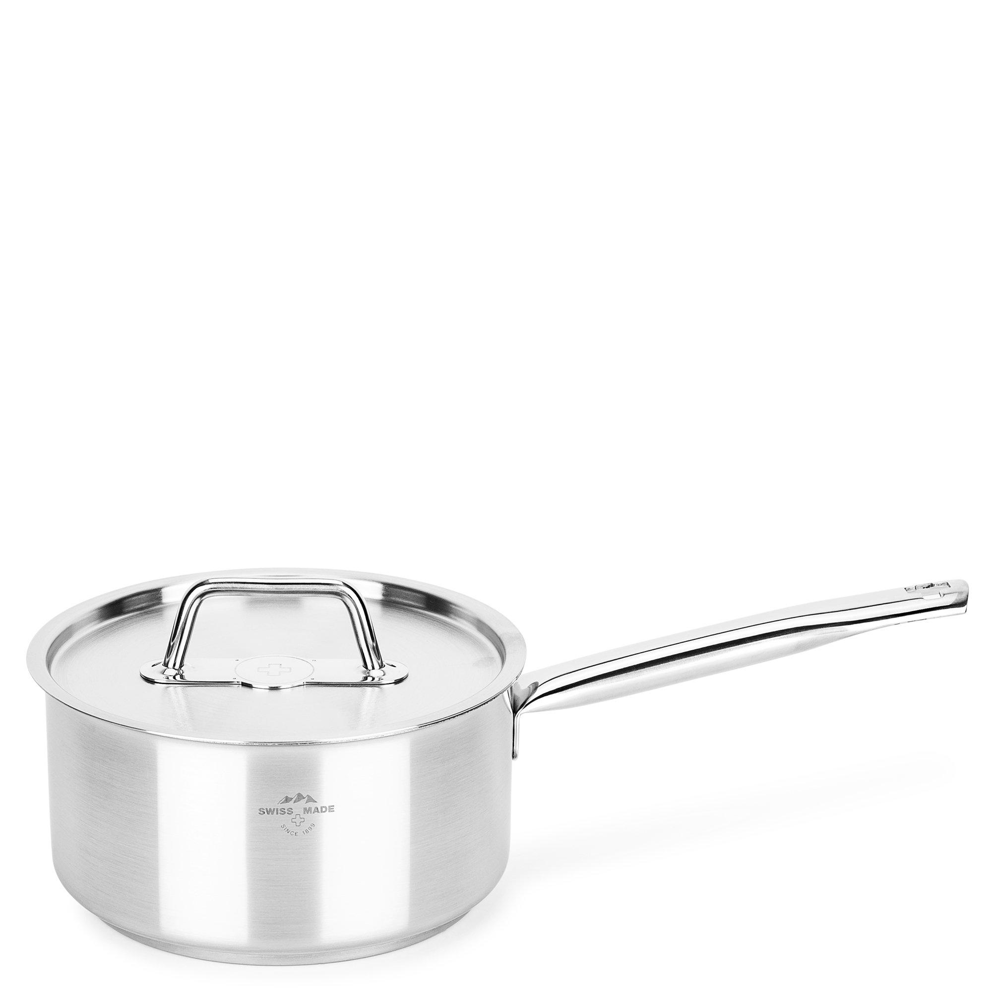 Ein Hoch auf die Edelstahl-Qualität: Diese Stielkasserolle mit Deckel der Schweizer Marke Kuhn Rikon bezaubert mit schlichtem Design und Langlebigkeit.