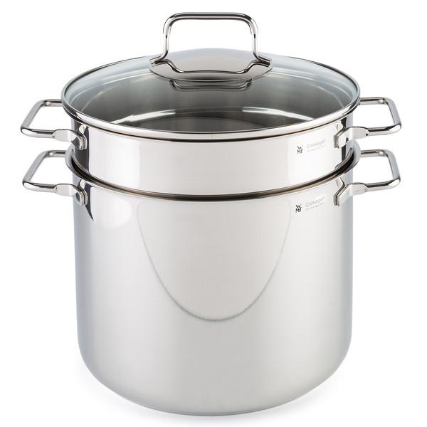 Um Nudeln spielend leicht al dente zu kochen, hat WMF Töpfe mit integriertem Sieb entwickelt. Das ist praktisch, denn sind die Nudeln fertig, heben Sie den Siebeinsatz einfach heraus – ohne Topflappen, denn die Griffe sind hohl und können sich nicht erhitzen. Das Nudelwasser kippen Sie bis auf eine kleine Menge in den Ausguss ab. Nun kommt das Sieb samt Nudeln in den Topf zurück, der Deckel wieder drauf – so bleibt die Pasta bis zum Servieren warm. Die WMF Modelle bestehen aus Cromargan® und sind mit einem TransTherm® Allherdboden versehen.