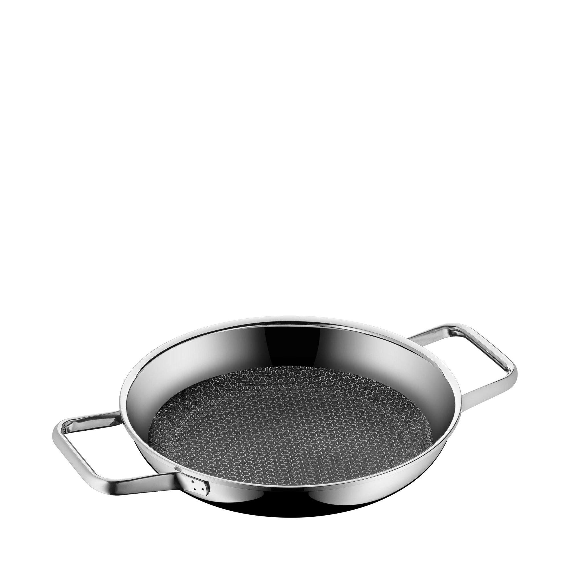 Ganz frisch vom Herd: Köstliche, dampfende Speisen gelangen mit den zeitlos designten Servierpfannen von WMF warm und bereit für den Genuss auf den Tisch. Egal, ob mit 20, 24 oder 28 Zentimetern Durchmessern, ob aus Edelstahl oder mit Beschichtung und ob für Fisch, Fleisch, Pasta oder Gemüse: Für jedes Gericht gibt es die passende Servierpfanne. Dank der beiden platzsparenden und praktischen Griffe passt sie nicht nur optimal in den Backofen, um beispielsweise Gemüse mit zart schmelzendem Käse zu gratinieren, auch im Küchenschrank nimmt der handliche Allrounder wenig Platz in Anspruch. Die WMF Serie Profi Resist vereint die besten Eigenschaften einer Edelstahlpfanne mit denen eines antihaftversiegelten Modells: Aluminiumkern, rostfreier Edelstahl innen und extrem widerstandsfähiger Chromstahl aussen. Zudem sorgt die beschichtete Bratfläche dafür, dass Ihnen so schnell nichts mehr anbrennt. Drehen Sie die Hitze voll auf: Edelstahl verträgt hohe Temperaturen und Geflügel und andere Fleischstücke bekommen eine leckere Kruste. Profi Resist Pfannen sind einfach perfekt für alles, was Sie schnell und scharf anbraten wollen. Brutzeln Sie drauflos! Die Pfanne wird Ihnen lange Freude bereiten, denn die erhabene Wabenstruktur aus Edelstahl schützt die Antihaftversiegelung der Profi Resist Modelle. Die Pfannen aus Mehrschichtmaterial verteilen die Wärme gleichmässig und sind für alle Herdarten geeignet, auch für energieeffiziente Induktionskochflächen. Zur formschönen Kollektion gehören hochwertige Stiel- und Servierpfannen sowie eine Wokpfanne.