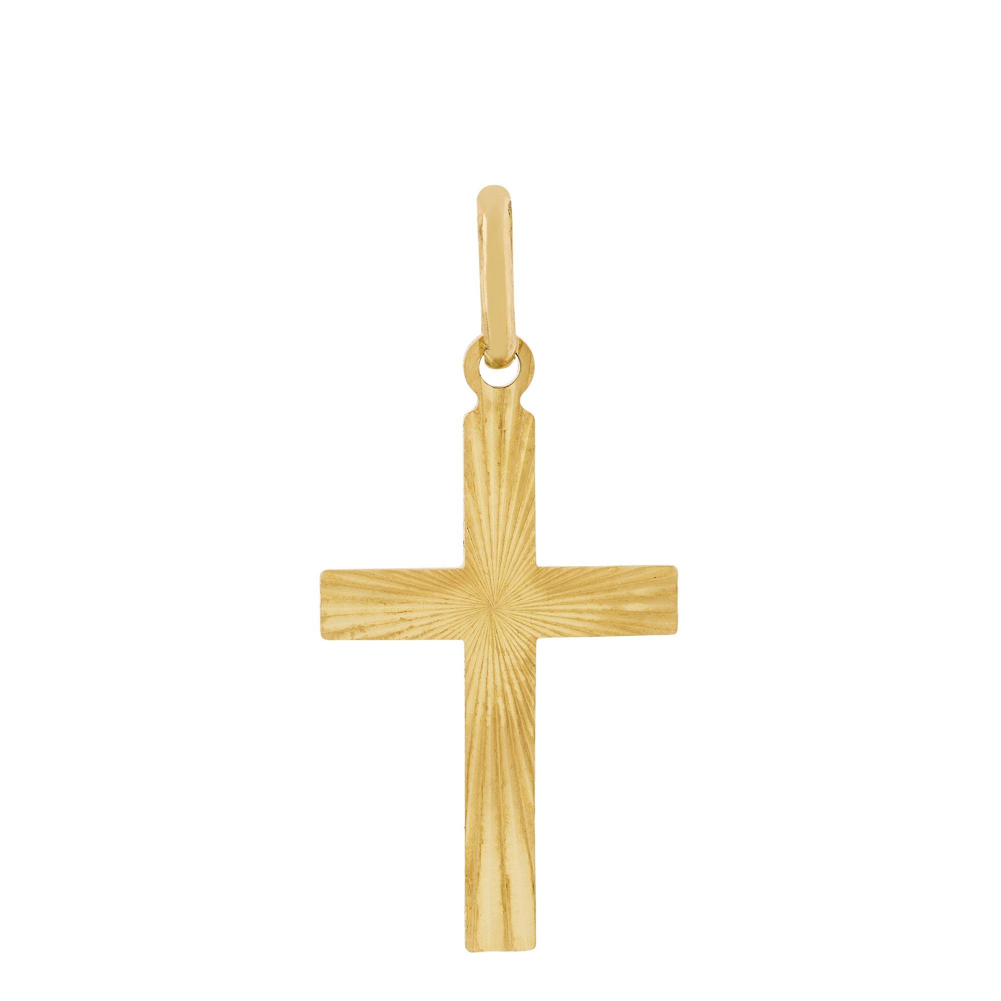 Der schlichte Kreuz-Anhänger von L'Atelier Gold 18 Karat by Manor ist ein symbolisches Accessoire aus 18-karätigem Gelbgold, welches jedem Look eine ganz persönliche Note verleiht. Das strahlenförmige Reliefmuster unterbricht den Glanz der Oberfläche, um ein mattes Finish zu erzeugen.