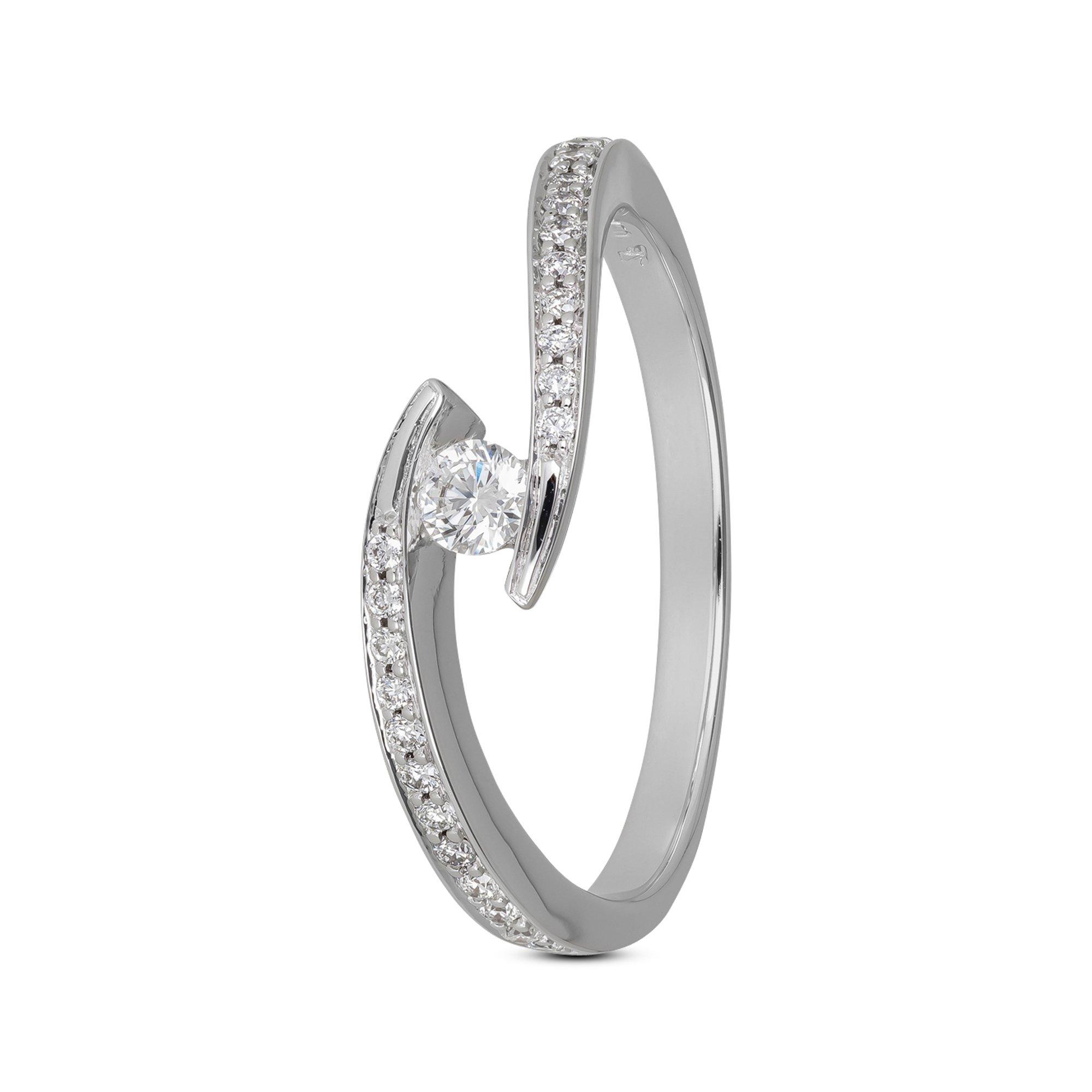 Der Spannring zählt zu den schlichten Ringmodellen und ist neben dem Solitärring einer der beliebtesten Verlobungsringe. Ein runder Diamant mit Brillantschliff dient als Blickfang und führt geschmackvoll in einen feinen Besatz von Seitensteinen über. Mit insgesamt 25 Schmucksteinen in 0.20 Karat zaubert der Ring filigranes Funkeln an die Hand. In 18 Karat Weissgold nimmt der Ring eine leicht geschwungene Form auf.