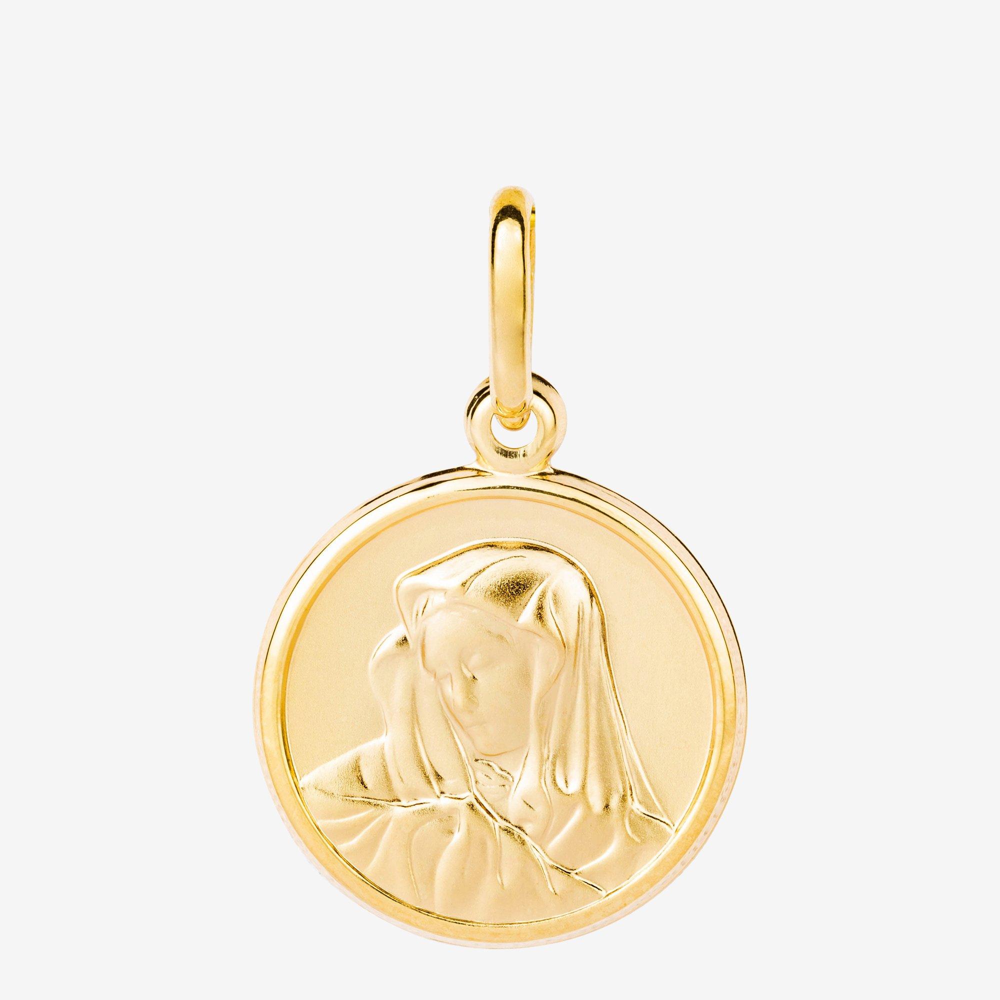 Der runde Anhänger von L' Atelier Gold 18 Karat by Manor trägt das Bild der Madonna als feines Relief. Er wird aus 18-karätigem Gelbgold gefertigt.