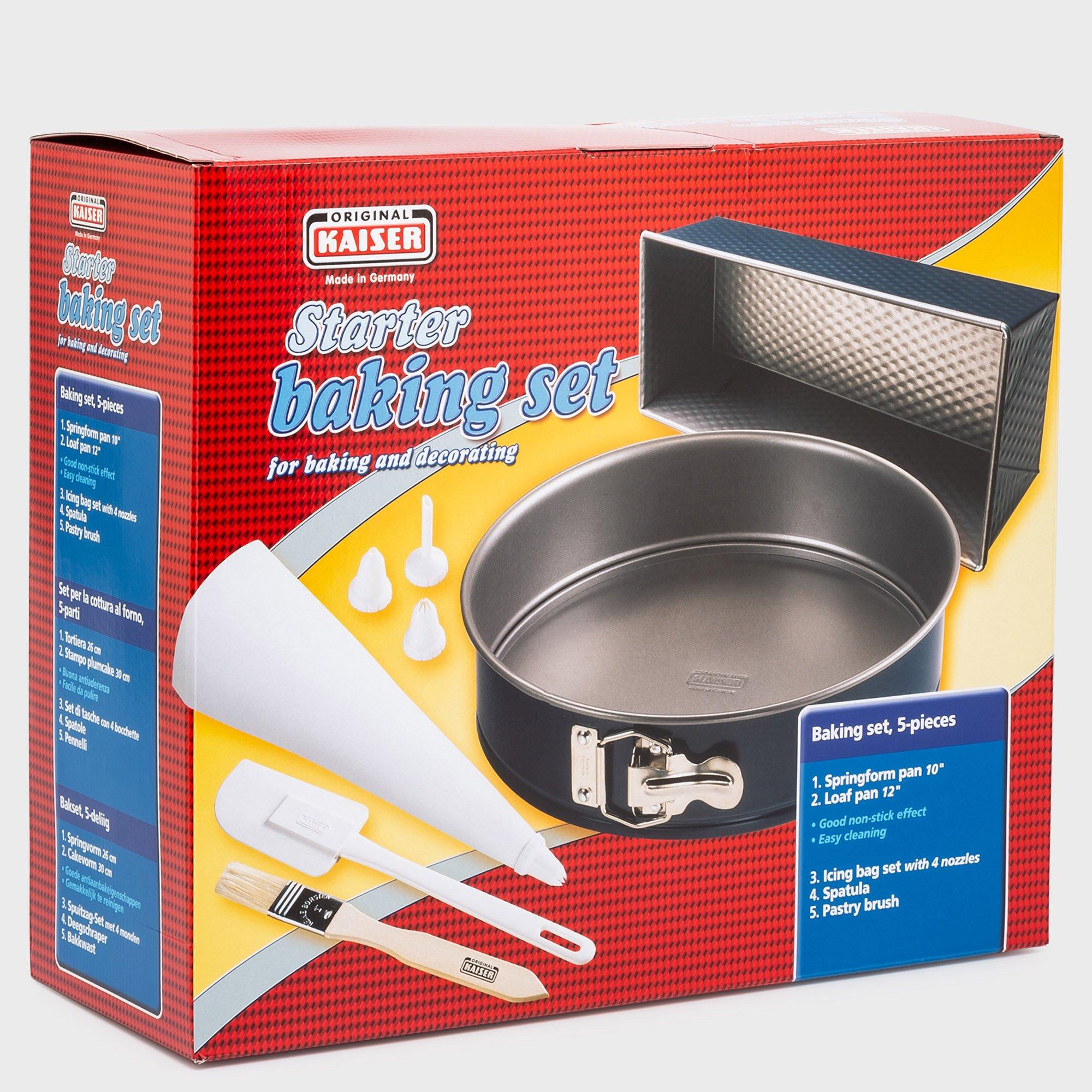 Backen für Anfänger leicht gemacht: Das Backform-Set von Kaiser beinhaltet zwei Backformen, einen Spritzbeutel mit vier austauschbaren Aufsätzen, einen Spatel zum Verstreichen der Glasur oder Creme und einen Pinsel.