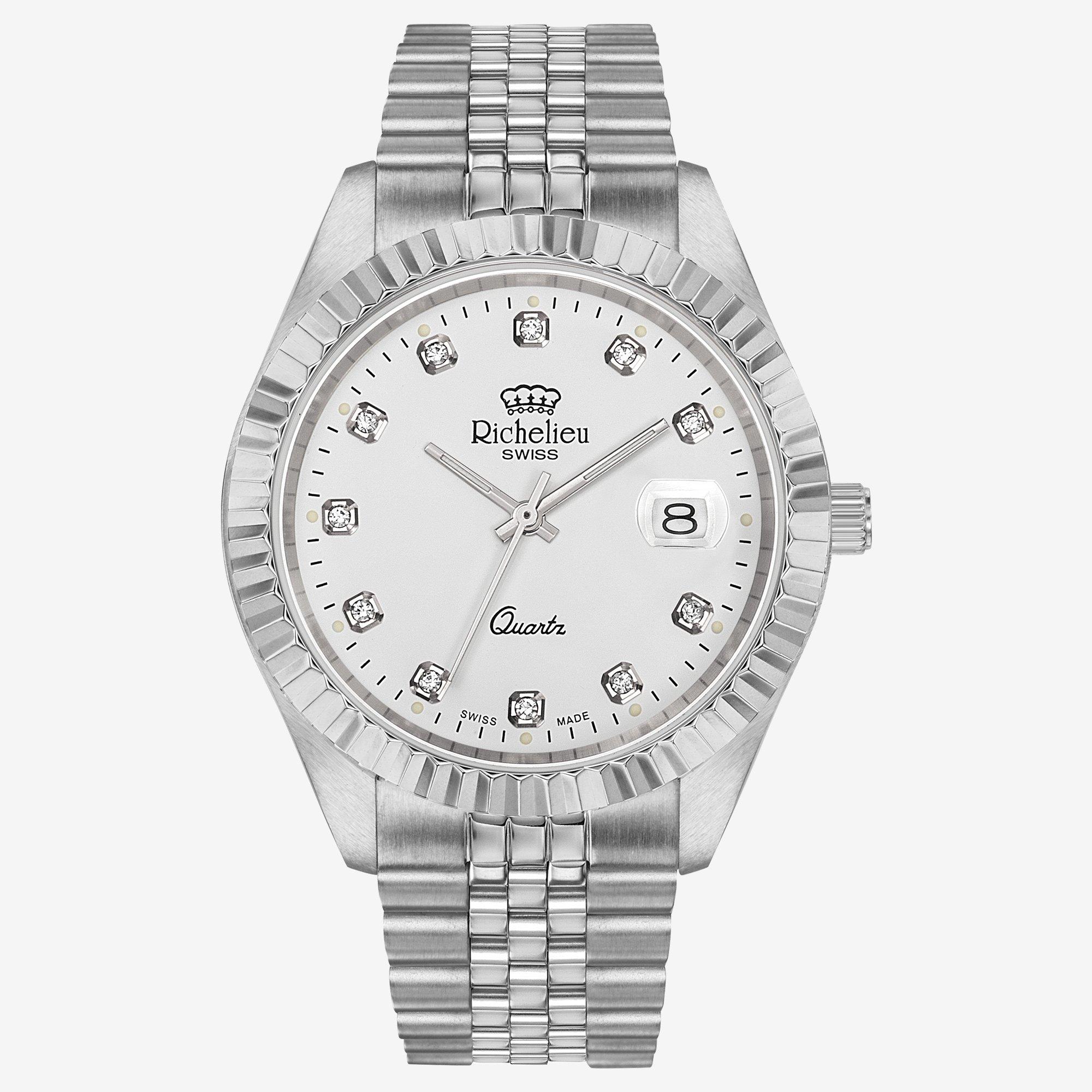 Hochwertige Analoguhr aus Edelstahl der Marke Richelieu - Facettierte Schmucksteine auf dem Ziffernblatt unterstreichen das elegante Design.