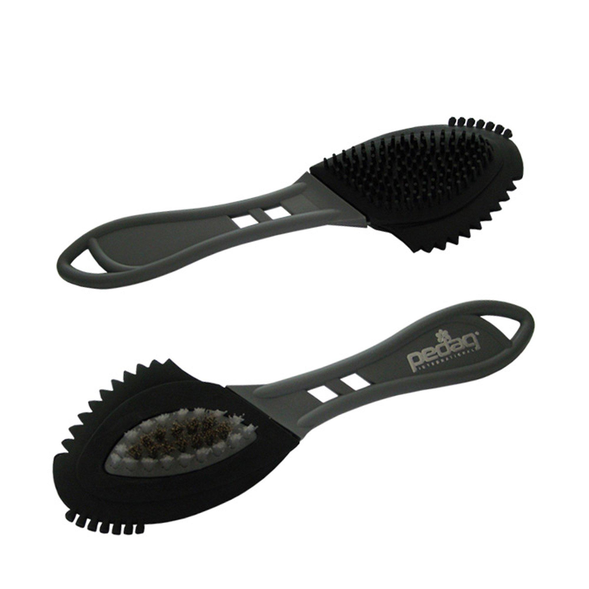 Raulederbürste mit Messingdraht, Gumminoppen und Reinigungskante erleichtert das Reinigen des Rauleders vom aufliegenden Schmutz.