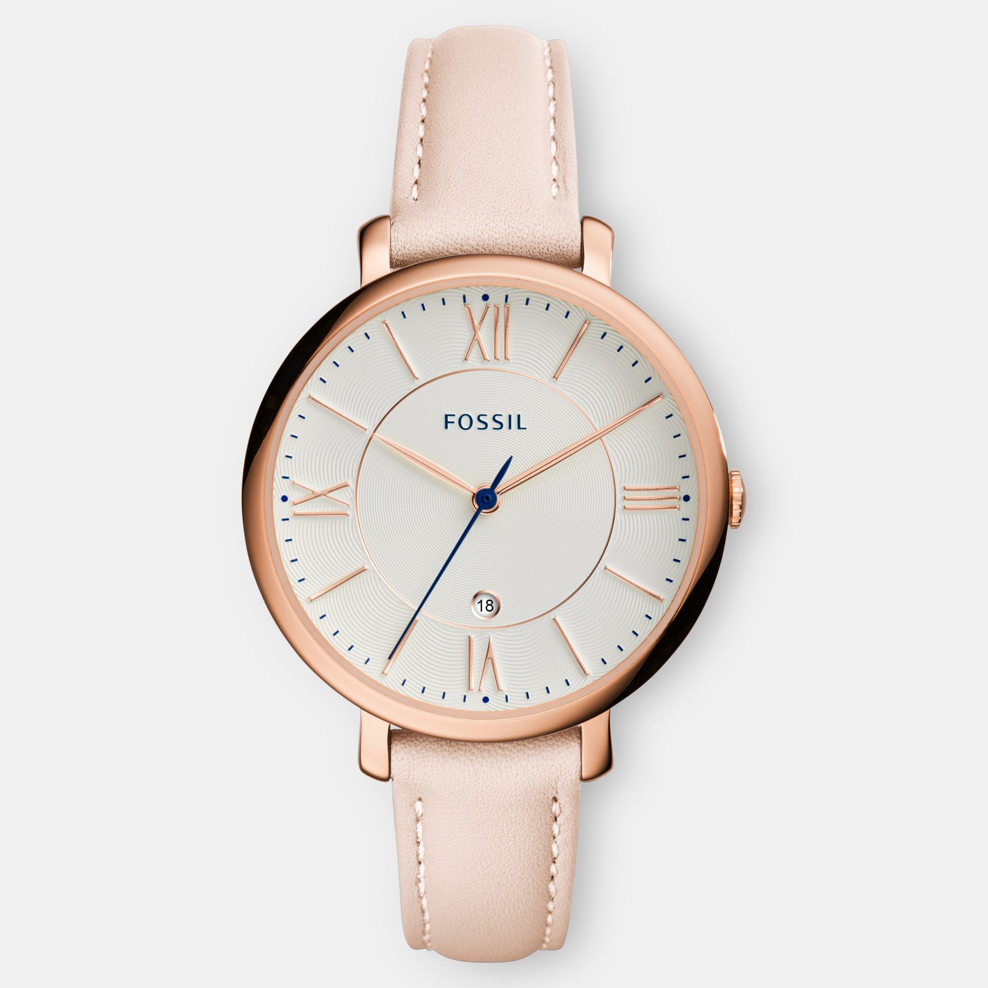Jaqueline zeigt sich als zarte Schönheit, mit der Sie an Ihrem Handgelenk romantische Akzente setzen. Die Analoguhr der Marke Fossil setzt sich aus einem hübschen Zifferblatt mit römischen Indizes, einem glänzenden Gehäuse und einem schmalen Armband aus rauem Leder zusammen.