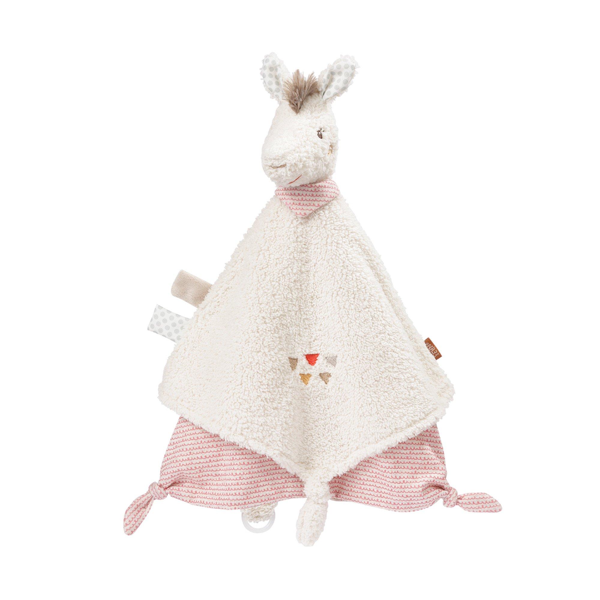 Das Schmusetuch von Fehn lädt ein mit der freundlichen Giraffe zu kuscheln. Der Schnuller kann ebenso am Kuscheltusch befestigt werden.