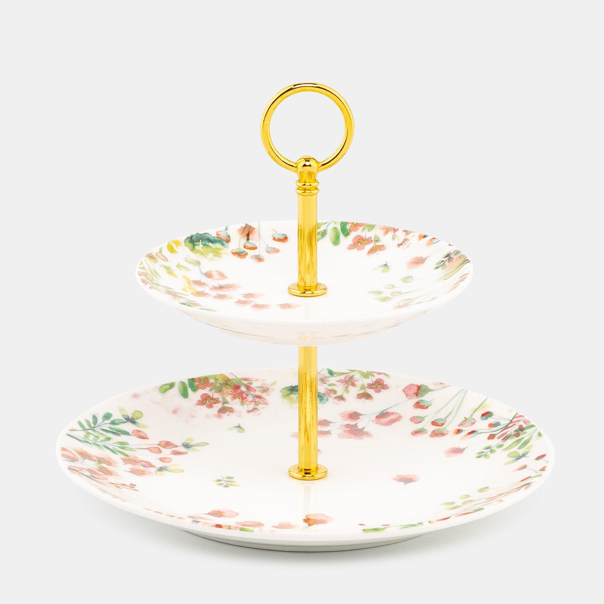 Die zweistufige Etagere aus der Kollektion New Romance ist mit einem romantischen Blüten-Dekor verziert und dient der hübschen Präsentation von Keksen oder kleinen Häppchen.