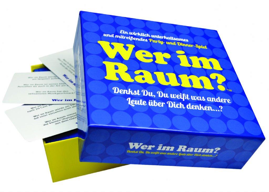 Denkst Du, Du weißt was andere Leute über Dich denken und wie die Wahrnehmung Anderer von Dir ist? Bist Du sicher, dass Deine Freunde Dich mit den selben Augen sehen, wie Du Dich selbst? Dieses Spiel wird Deine Selbsteinschätzung für immer verändern.Wer im Raum…? ist ein wirklich unterhaltsames und mitreißendes Party- und Dinner-Spiel, bei dem unsere Selbstwahrnehmung dem Eindruck Anderer von uns gegenüber gestellt wird. Die perfekte Methode mit viel Spaß mehr über Dich und Deine Freunde herauszufinden! Dieses Spiel beinhaltet mehr als 300 peinliche, lustige und provokante Fragen, die alle mit `Wer im Raum…?´ beginnen. Und so funktioniert´s: zieh eine Karte und lies die erste Frage laut vor. Dann lass jeden in der Runde für einen Moment überlegen, zähle bis drei und lass Jeden im Raum, auf die Person zeigen, auf die die Aussage am ehesten zutrifft. Sei dabei auf Überraschungen gefasst!Wer im Raum…? ist ein tolles Spiel für Dinner Parties und Weinabende und ein super Geschenk zu jeder Gelegenheit.