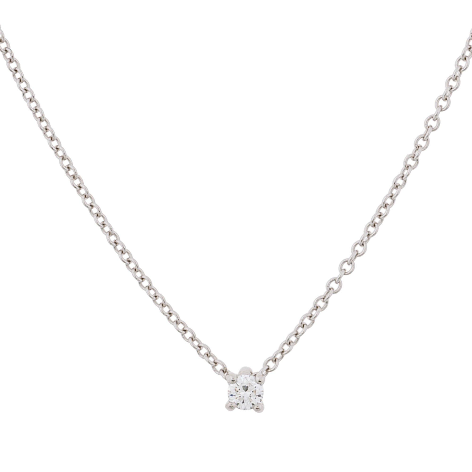 Ein betörend funkelnder Brillant in einer zarten, viergriffigen Krappenfassung bildet das Herzstück dieses Colliers des Schweizer Schmuckherstellers Sergio Ferris. Die filigrane Gliederkette besteht ebenso wie die Fassung aus poliertem Weissgold, welches das Leuchten des Brillanten stilvoll unterstreicht.