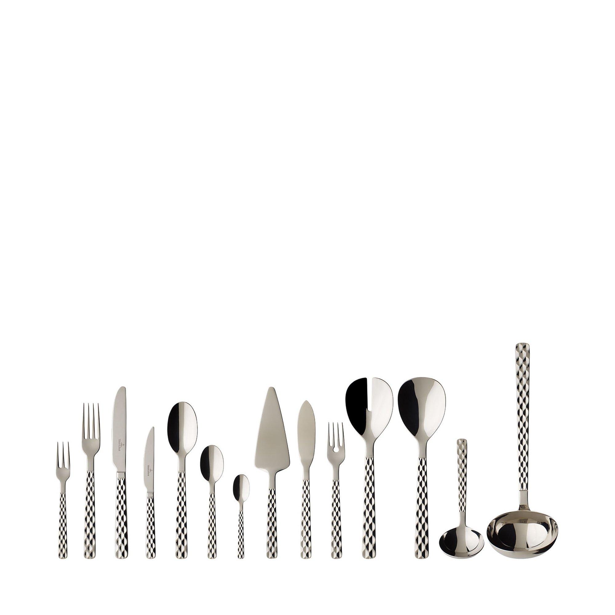 Das Tafelbesteck Boston passt mit der strukturierten Oberfläche perfekt zum diamantartigen Dekor der Boston Gläser und rundet den modernen Country-Lifestyle perfekt ab. Ob beim gemütlichen Abendessen mit Freunden oder ganz vertraut zu zweit: Das Besteck von Boston passt einfach immer. Das moderne 113-teilige Tafelbesteck für zwölf Personen von Boston begeistert mit besonderem Design. Das große Set beinhaltet Servier-Besteck und Suppenschöpfer. Lernen Sie die Boston-Kollektionen für besondere Tisch-Arrangements kennen.Das Set besteht aus: