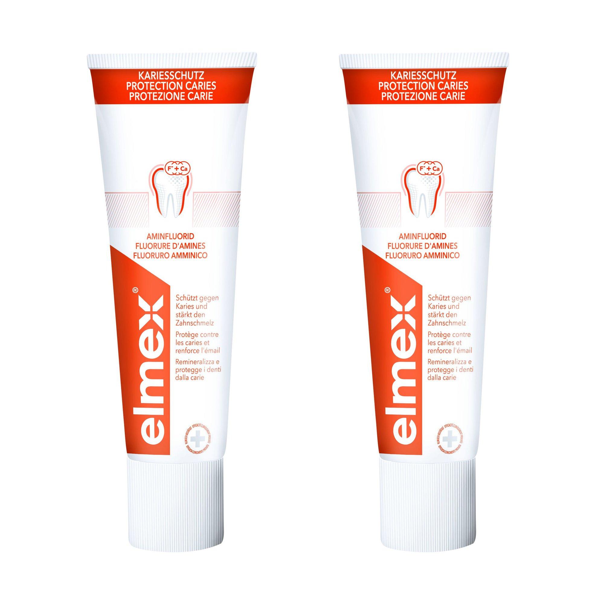 "Sagen Sie Karies den Kampf an. Mit der elmex Kariesschutz Professional Zahnpasta mit hochwirksamer Aminfluorid-Formel. Die klinisch bestätigte Formel bildet ein 2-fach aktives Kalzium-Fluorid-Schutzschild um Ihre Zähne, remineralisiert angegriffene Stellen im Zahnschmelz und macht Ihre Zähne so widerstandsfähiger gegen Karies. Durch die Wiedereinlagerung von Mineralien in den Zahn wird der Zahnschmelz gehärtet und ein effektiver Kariesschutz wird aufgebaut.
