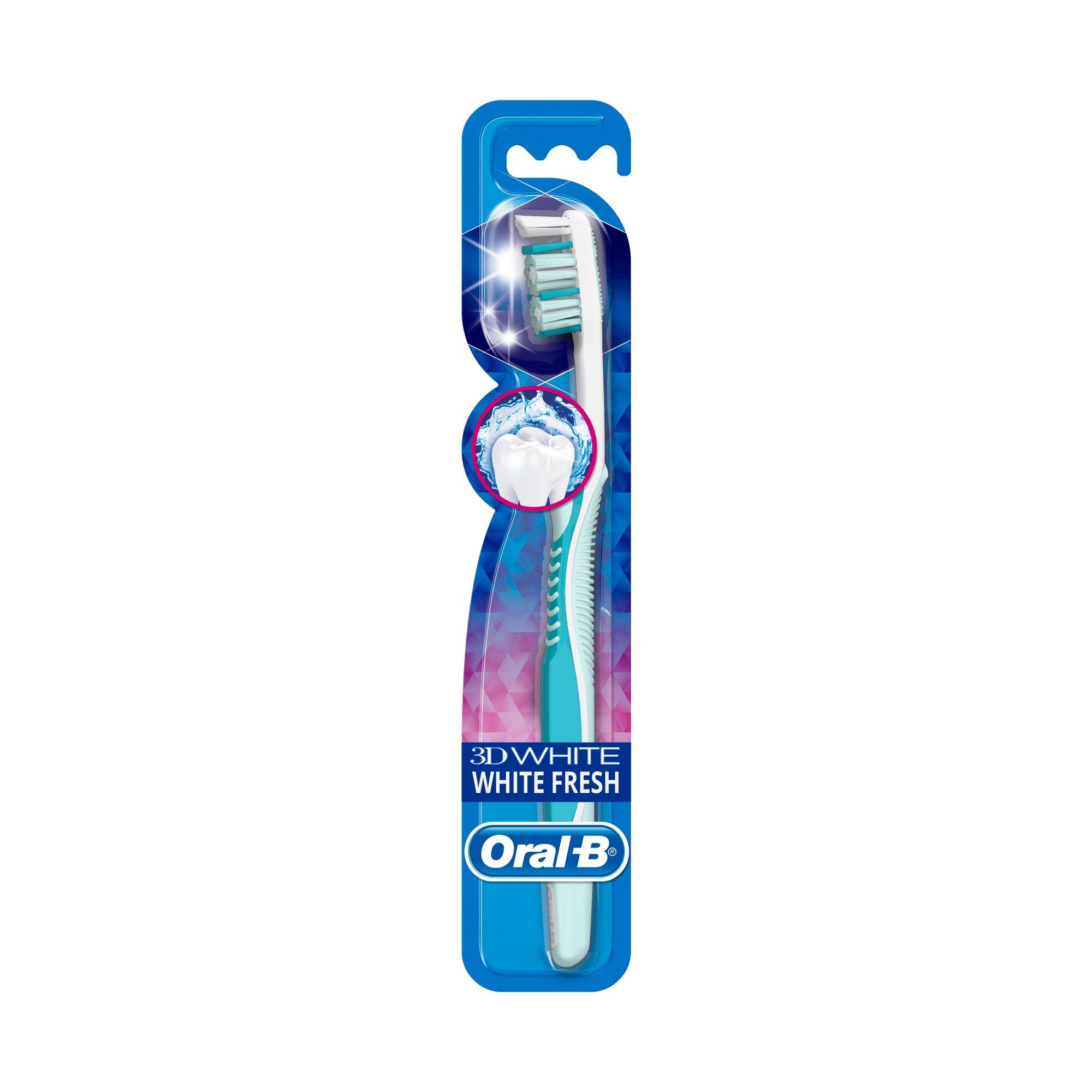 Die Oral-B 3DWhite Fresh Zahnbürste poliert jeden Morgen Ihre Zähne für ein weißeres Lächeln. Die speziell designten Poliereinsätze umschließen jeden Zahn, um ihn gründlich zu reinigen. Die 3DWhite Zahnbürste verfügt über einen PowerTip Bürstenkopf, der in die engen Zahnzwischenräume gelangt. Sie reinigt sanft, um Ihren Zahnschmelz zu schützen. Die Indicator-Borsten sichern ab, dass Sie Ihre Zahnbürste stets mit maximaler Wirksamkeit verwenden, um ein weißeres Lächeln zu erhalten.